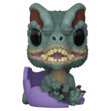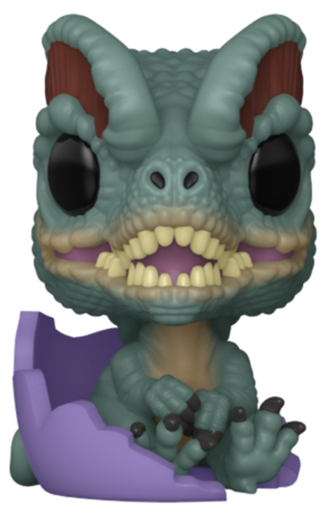• Features a Dilophosaurus character in a hatching pose