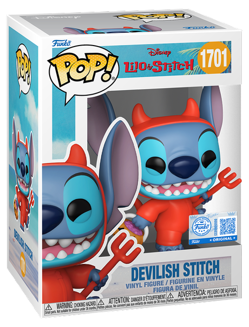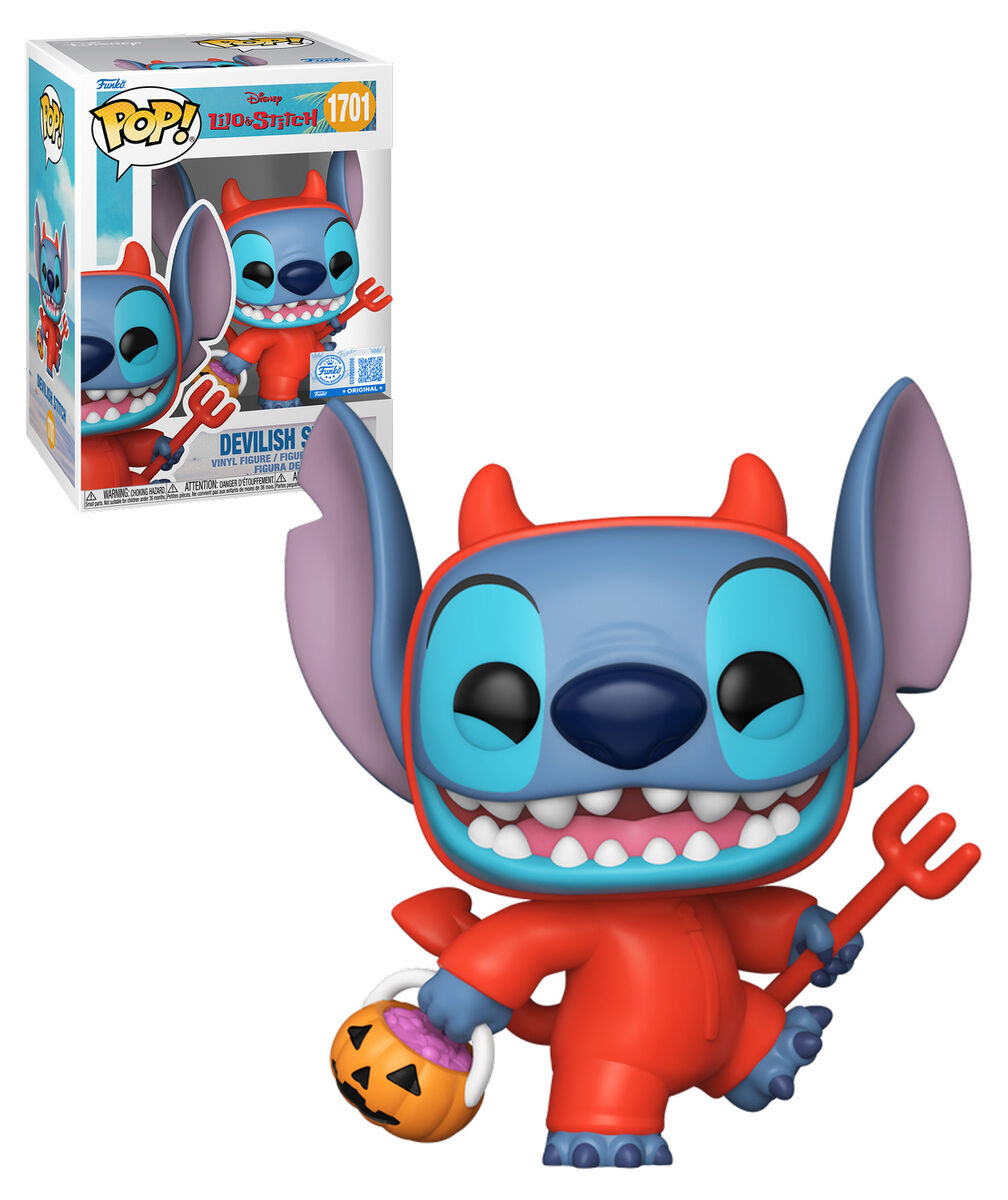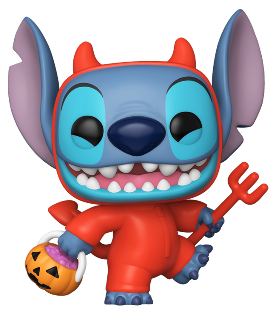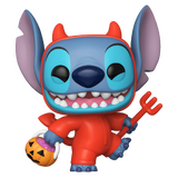Stitch is up to his usual mischief - this time dressed as a cheeky little devil . This Funko POP! Disney figure features Stitch in a red devil costume, complete with a pitchfork and candy bucket, ready for some Halloween trick-or-treat fun. A great addition to any Lilo & Stitch or Disney POP! collection, this standard-size vinyl figure comes in mint condition and is ideal for display in or out of the box.