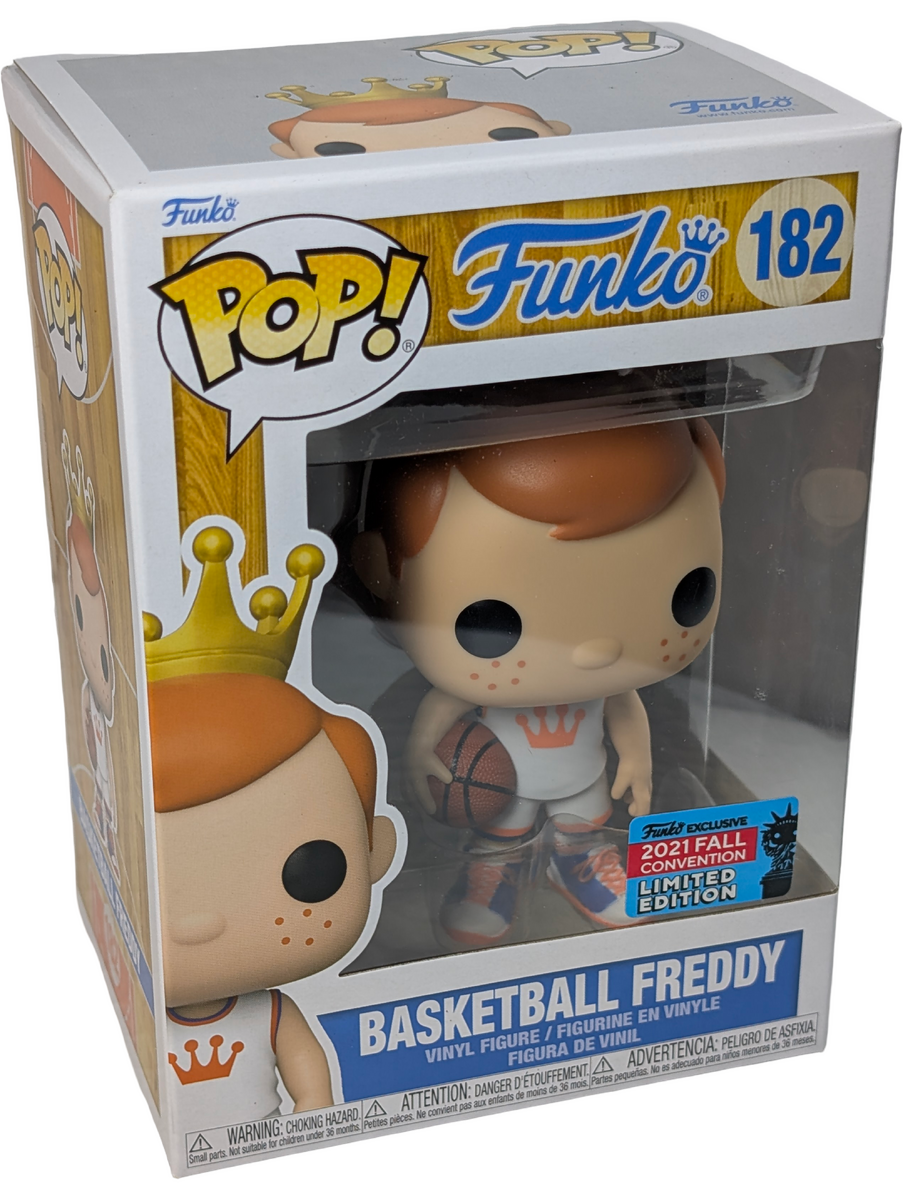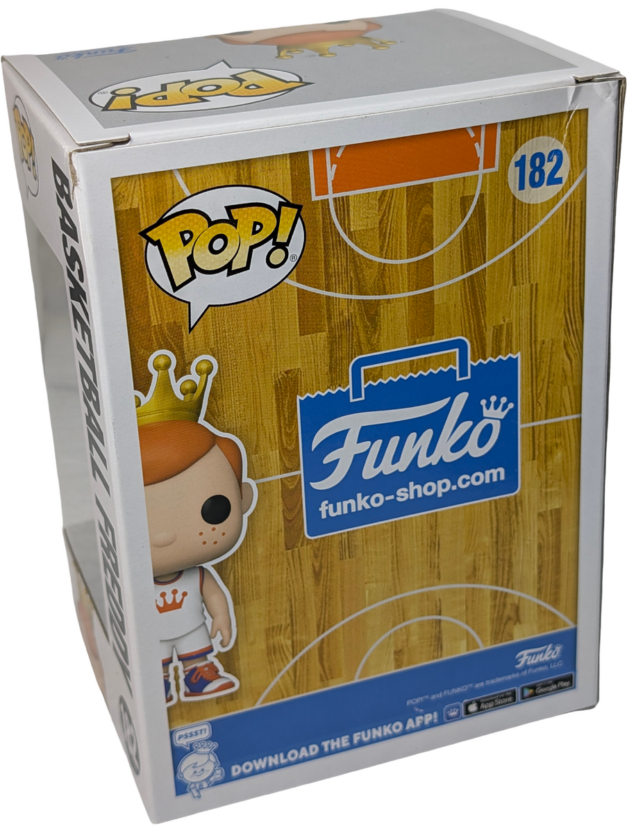 A display-ready piece suited to collectors who focus on the figure itself. Condition notes: Crease to back top of box. This vinyl figure features Basketball Freddy, a sporty variation of Freddy Funko dressed in a basketball outfit. Freddy Funko is widely recognised as Funko's mascot character, often appearing in themed releases that reflect pop culture and lifestyle ideas. This item is offered as a non-mint boxed collectible due to a crease to the back top of the box. The figure itself remains suitable for shelf or cabinet display.