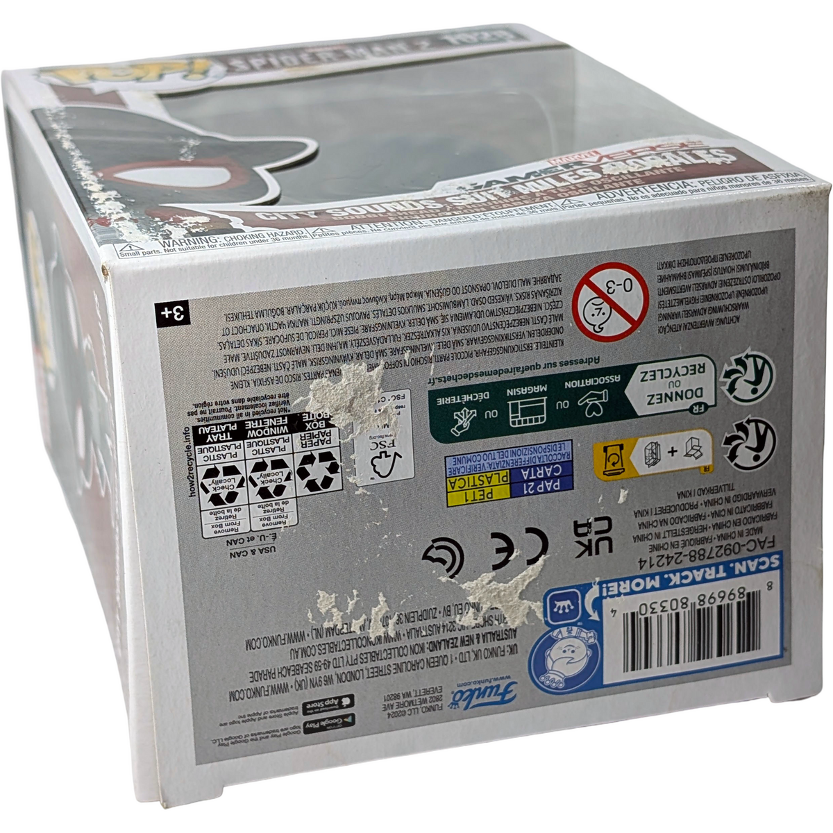 This Funko POP! Marvel Spider-Man Miles Morales City Sounds Suit figure captures Miles in his distinctive City Sounds Suit from the Marvel Gamerverse. It's the same detailed vinyl figure collectors love, just with packaging that's seen better days. Condition notes: moisture/condensation damage to cardboard; wide/soft dents on front and back of box The figure itself is undamaged and ideal for display, whether you're building out a Miles Morales shelf or adding another Spider-Man variant to your collection.