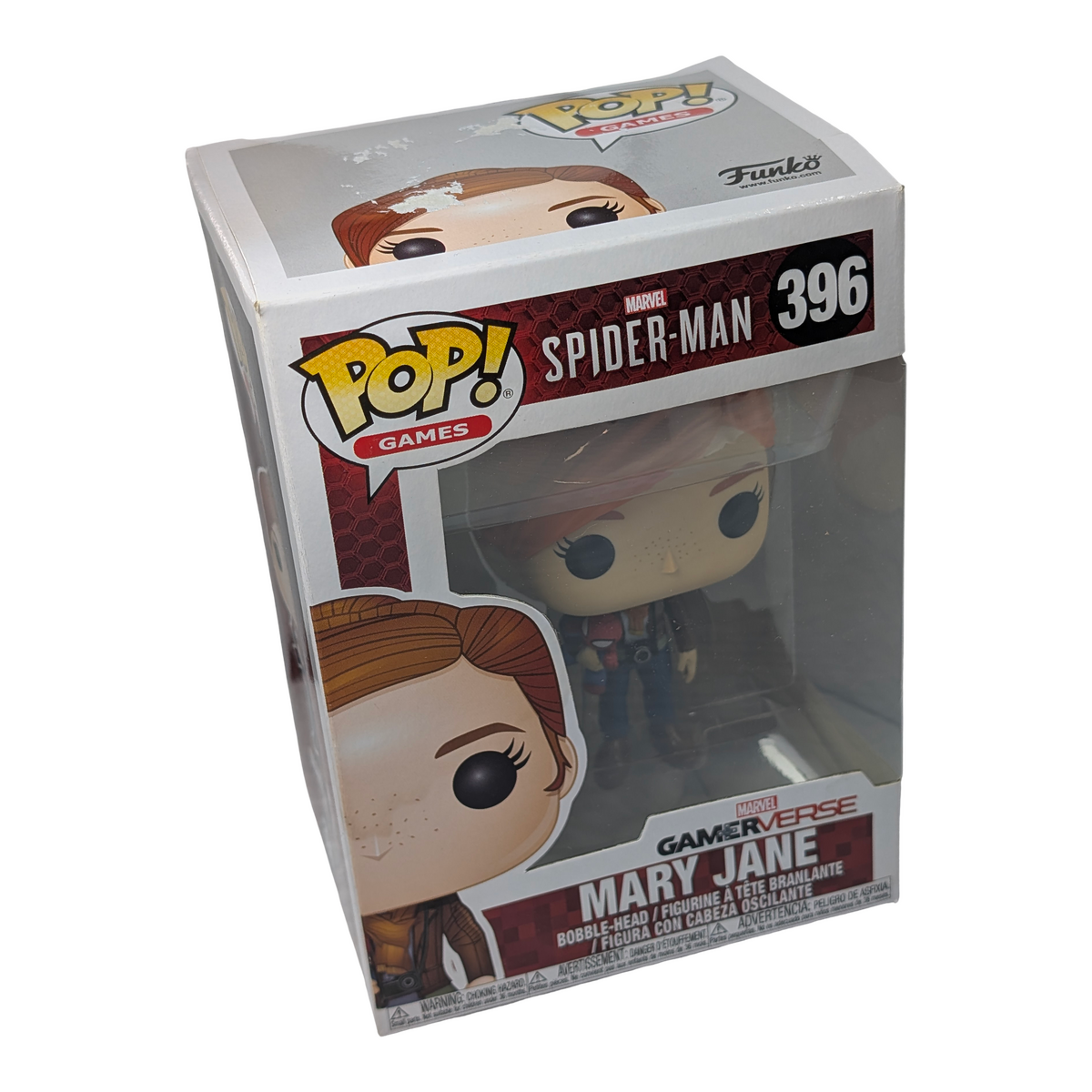 Funko POP! Marvel Spider-Man #396 Mary Jane is a vinyl collectible from the Marvel Gamerverse series, showing Mary Jane holding a Spider-Man plush toy. Condition notes: moisture/condensation damage to cardboard; wide/soft dents on front and back of box The figure itself is undamaged and suitable for display, while the outer box shows visible wear. A good option for out-of-box collectors or anyone less concerned with pristine packaging.