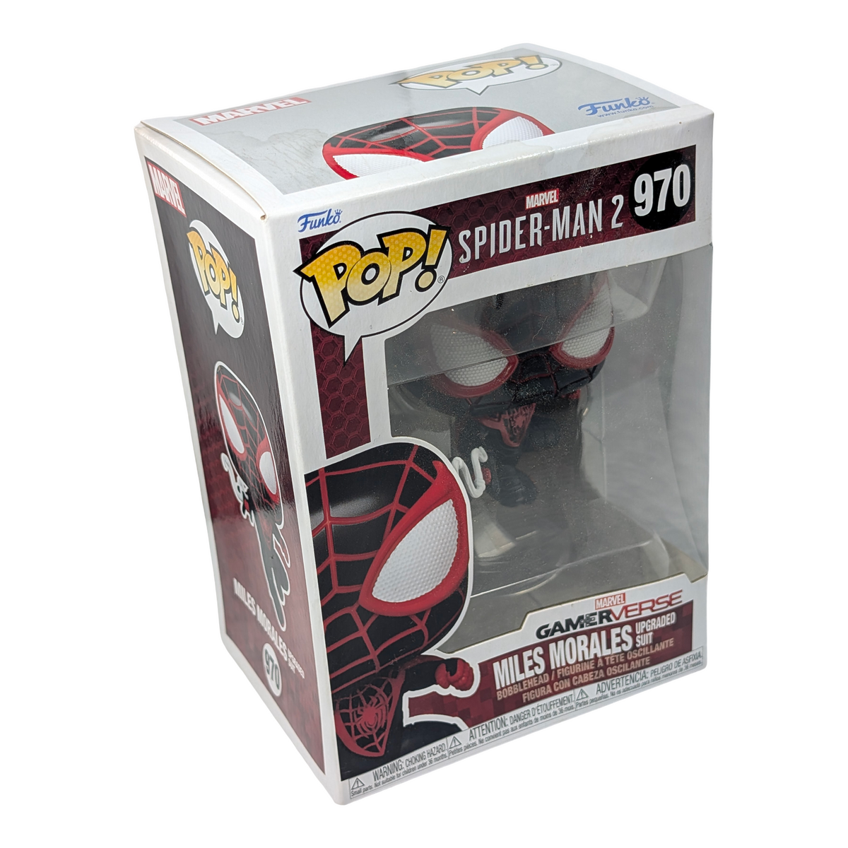 This POP! Marvel Spider-Man #970 features Miles Morales in his Upgraded Suit from the Marvel Gamerverse series, captured in an action pose designed for display. Condition notes: moisture/condensation damage to cardboard; wide/soft dents on front and back of box The figure itself remains undamaged and is made from vinyl, suitable for collectors who prioritise the figure over box condition. A solid option for display-focused collections or fans of Miles Morales.
