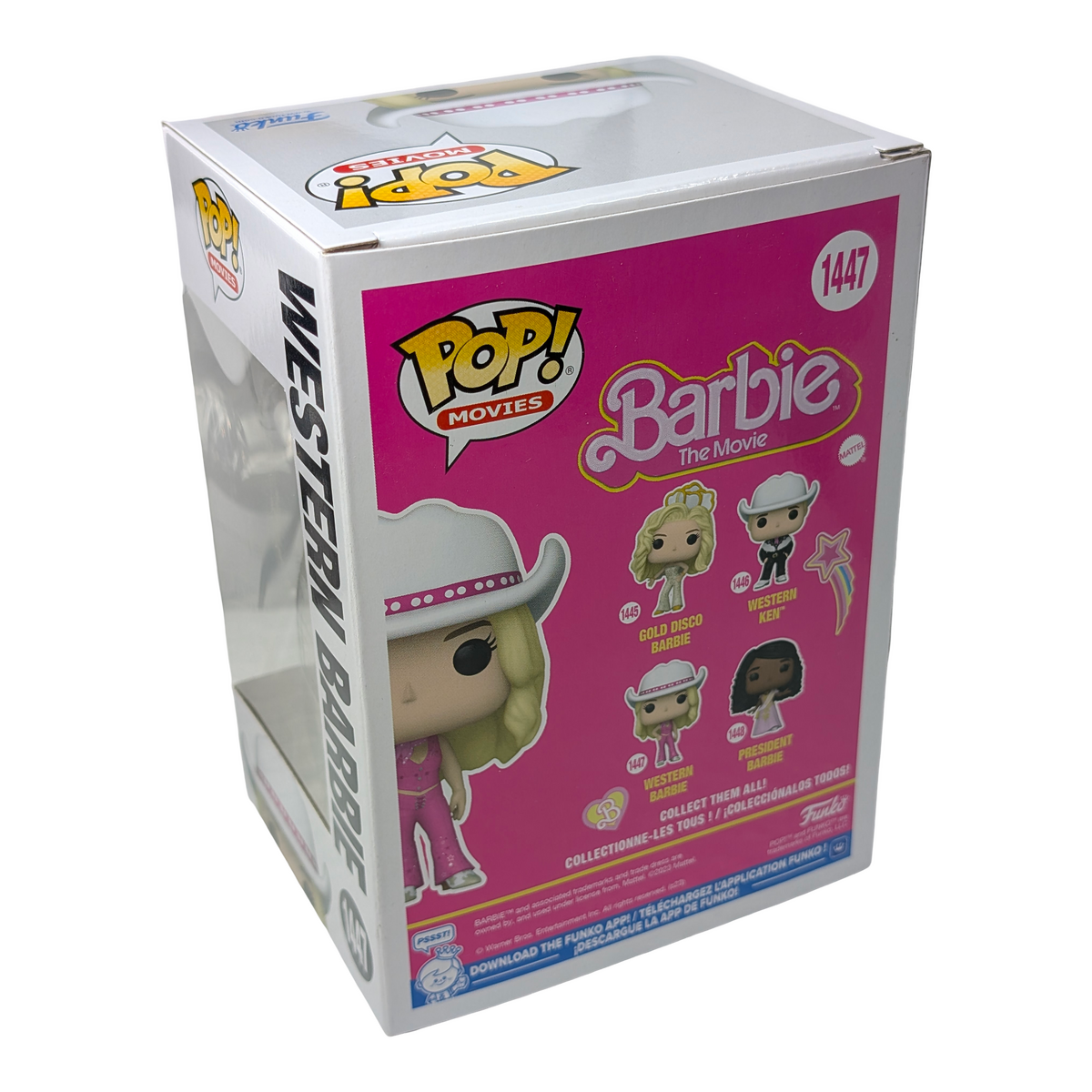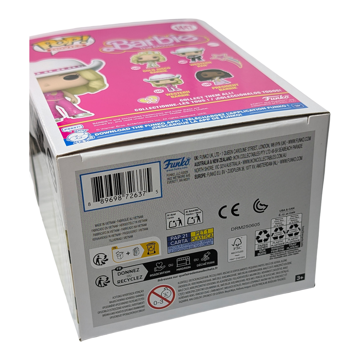 This Funko POP! Movies figure features Western Barbie from Barbie The Movie, styled in a pink vest and jeans with a white cowboy hat. It's a great display piece for fans of the film and Funko collectors alike. Condition notes: Small dent/crease at top of side edge This item is brand new but non-mint, with packaging imperfections as noted above. The figure itself is undamaged and suitable for display, whether kept in-box or removed.