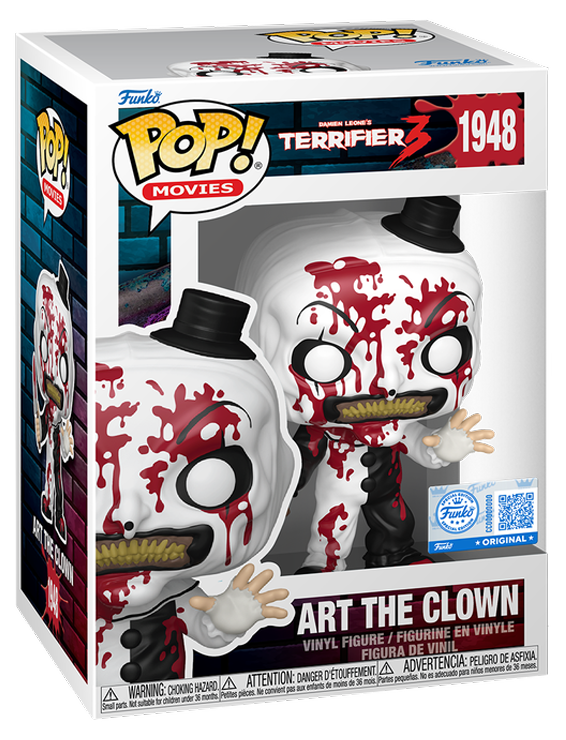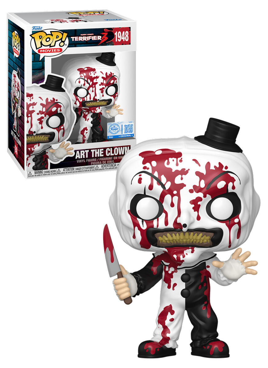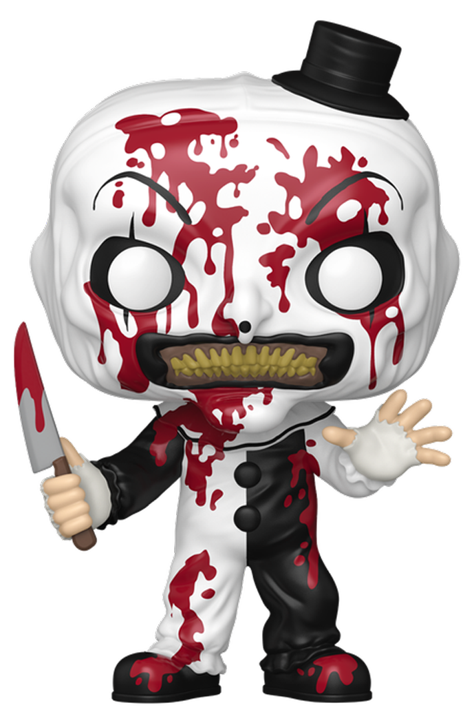 A recognisable design suited to long-term display. This Funko POP! Movies figure features Art The Clown from Terrifier 3, depicted holding a knife in a bloody variant design. As the silent and unsettling antagonist of the Terrifier franchise, Art The Clown has become a standout modern horror character known for his striking black-and-white clown appearance. Crafted in vinyl and standing in the standard POP! format, this figure measures approximately 115 x 89 x 160 mm (4.53 x 3.5 x 6.3 inches including packaging) and weighs around 130 g. Whether displayed in-box or out, it makes a bold addition to a horror-themed collection. A distinctive piece for fans of contemporary horror cinema.