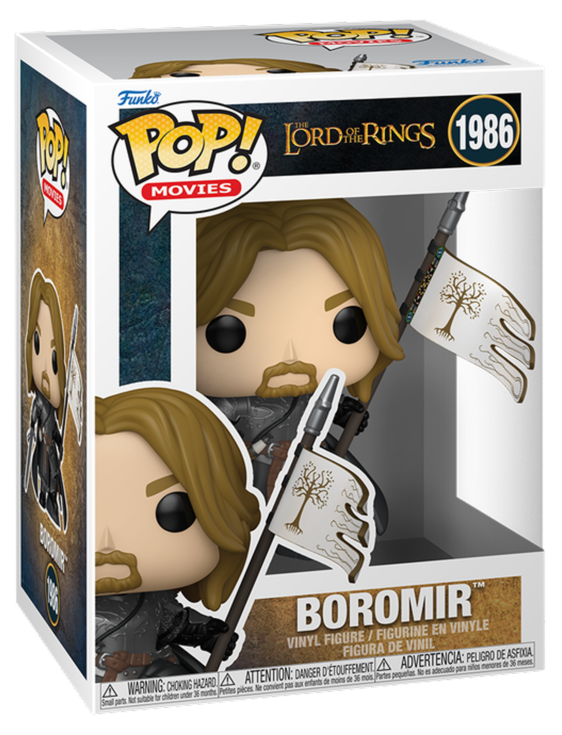 A character figure that complements existing displays. Boromir is one of the members of the Fellowship in The Lord of the Rings, representing the race of Men and serving as the son of the Steward of Gondor. This Funko POP! Movies figure shows the character holding his sword and the flag of Gondor. Presented in the stylised POP! format, the vinyl figure is designed for collectors and display. It fits neatly on a shelf, desk, or in a themed display alongside other characters from Middle-earth.