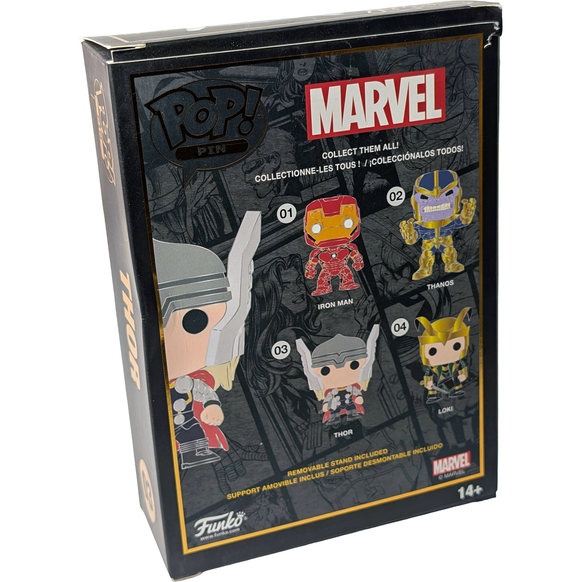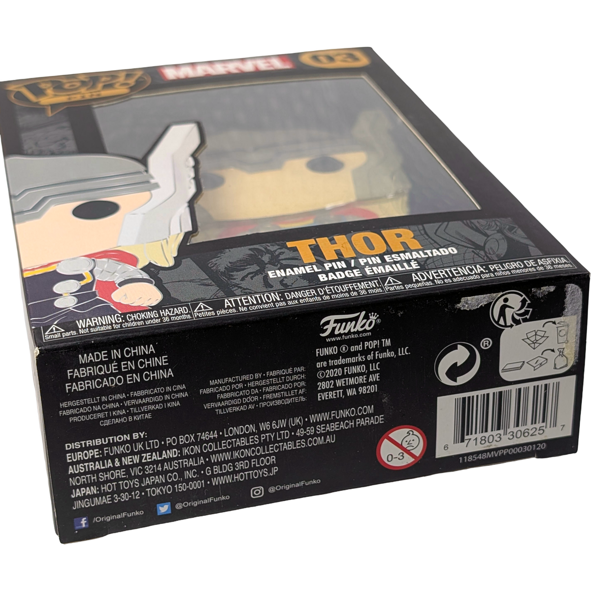 A recognisable design suited to long-term display. Condition notes: Small tear on one corner of box. This Funko POP! Pin features Thor in his classic costume, capturing the God of Thunder in the familiar Funko style. Thor is a long-standing Marvel character, widely known as a founding member of the Avengers and a central figure in Marvel comics and films. With packaging wear noted, this pin is well suited to collectors planning to display it rather than keep it sealed.