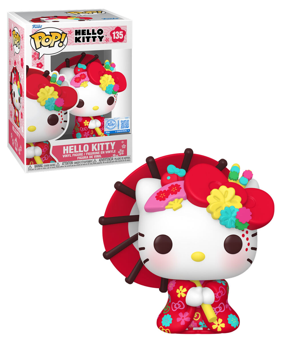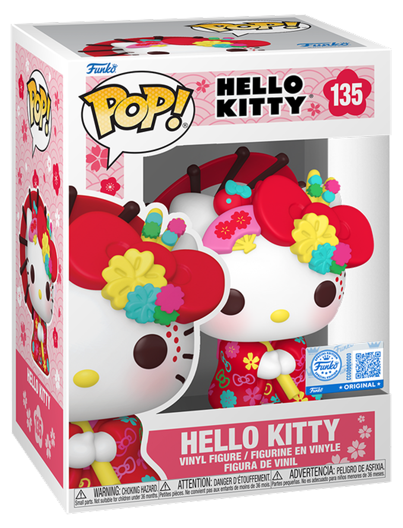 A well-known character captured in classic Funko style. This POP! Sanrio #135 Hello Kitty (Kimono) figure depicts Hello Kitty in traditional Japanese attire, blending her signature design with a cultural-inspired look. Hello Kitty has been a globally recognised character since her debut in 1974, known for her simple features and enduring appeal. Crafted in multi-coloured vinyl, this POP! Standard release suits collectors of Sanrio characters and those building a themed display.