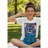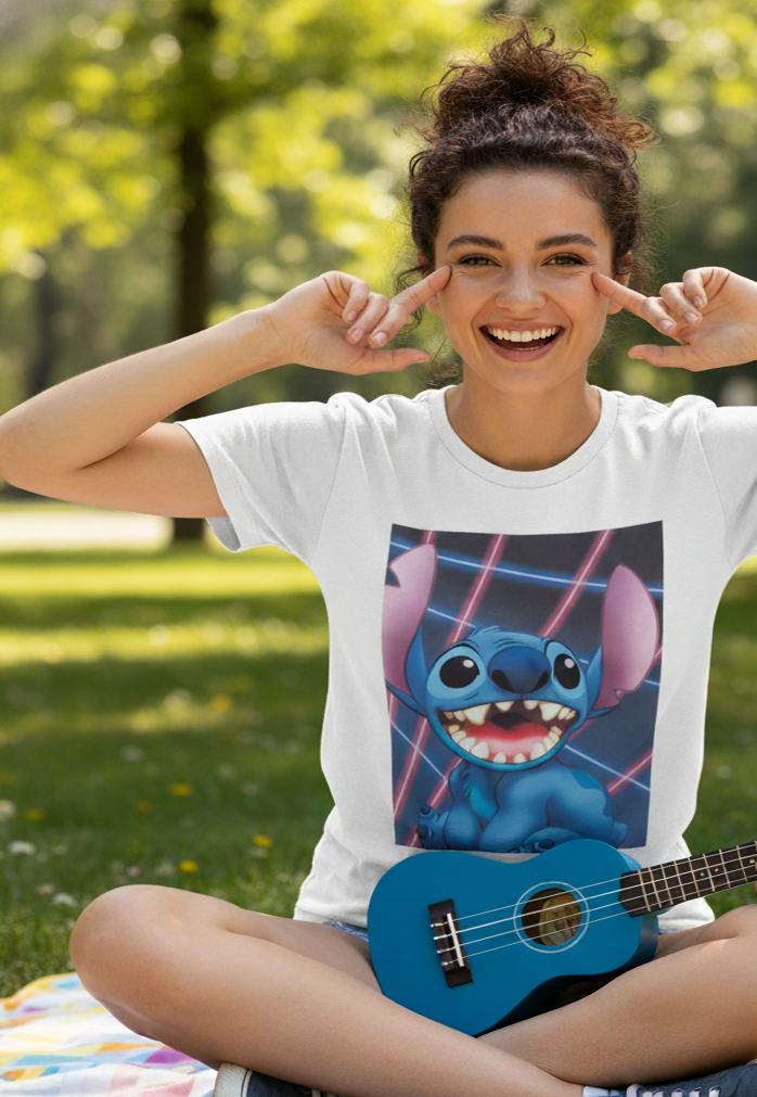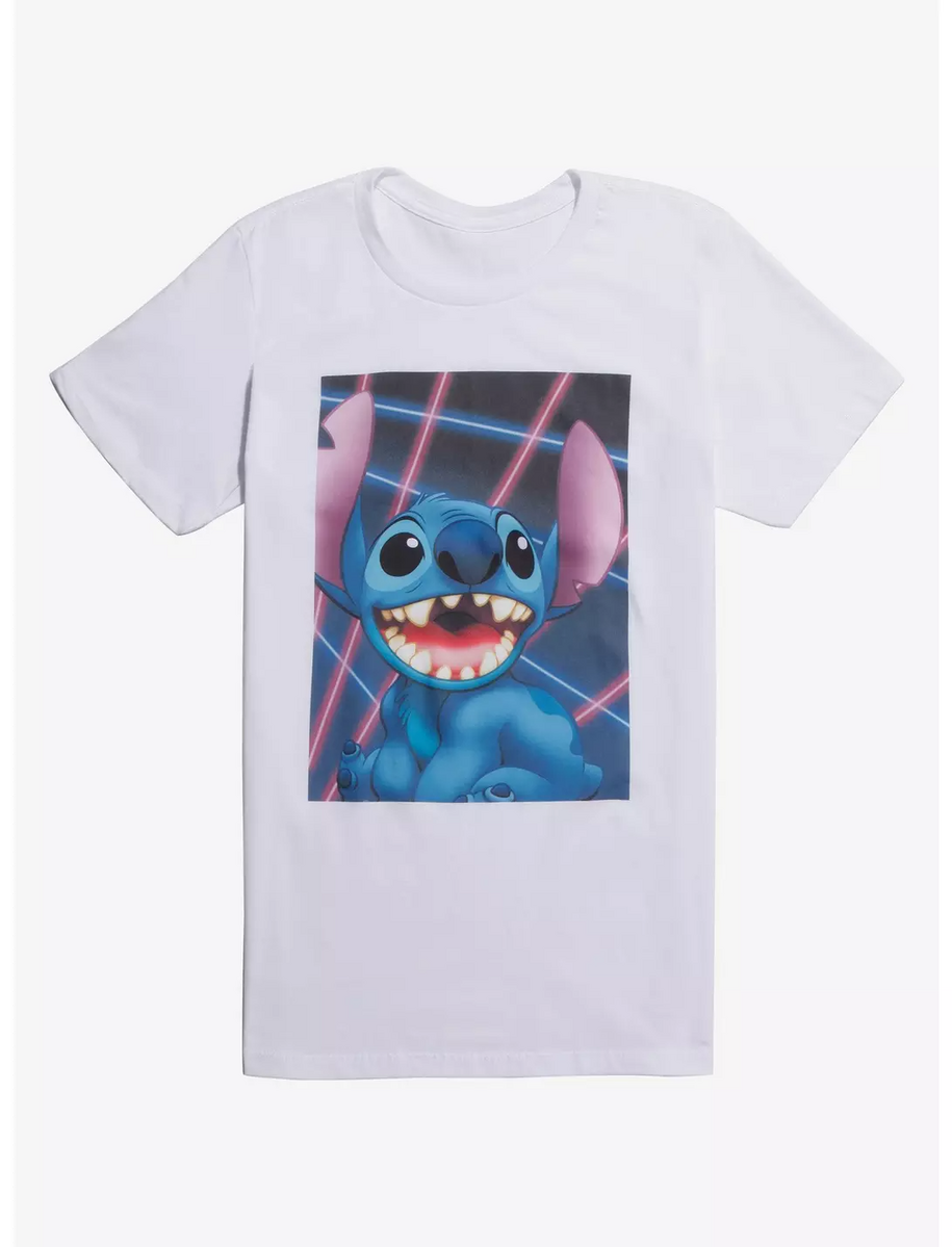 The shirt features a bold, high-contrast graphic centered on a detailed portrait of the mischievous yet lovable alien, Stitch. The design is accentuated by a surrounding field of intersecting red and blue laser beams, creating a vibrant and edgy aesthetic that perfectly captures Stitch's chaotic charm.