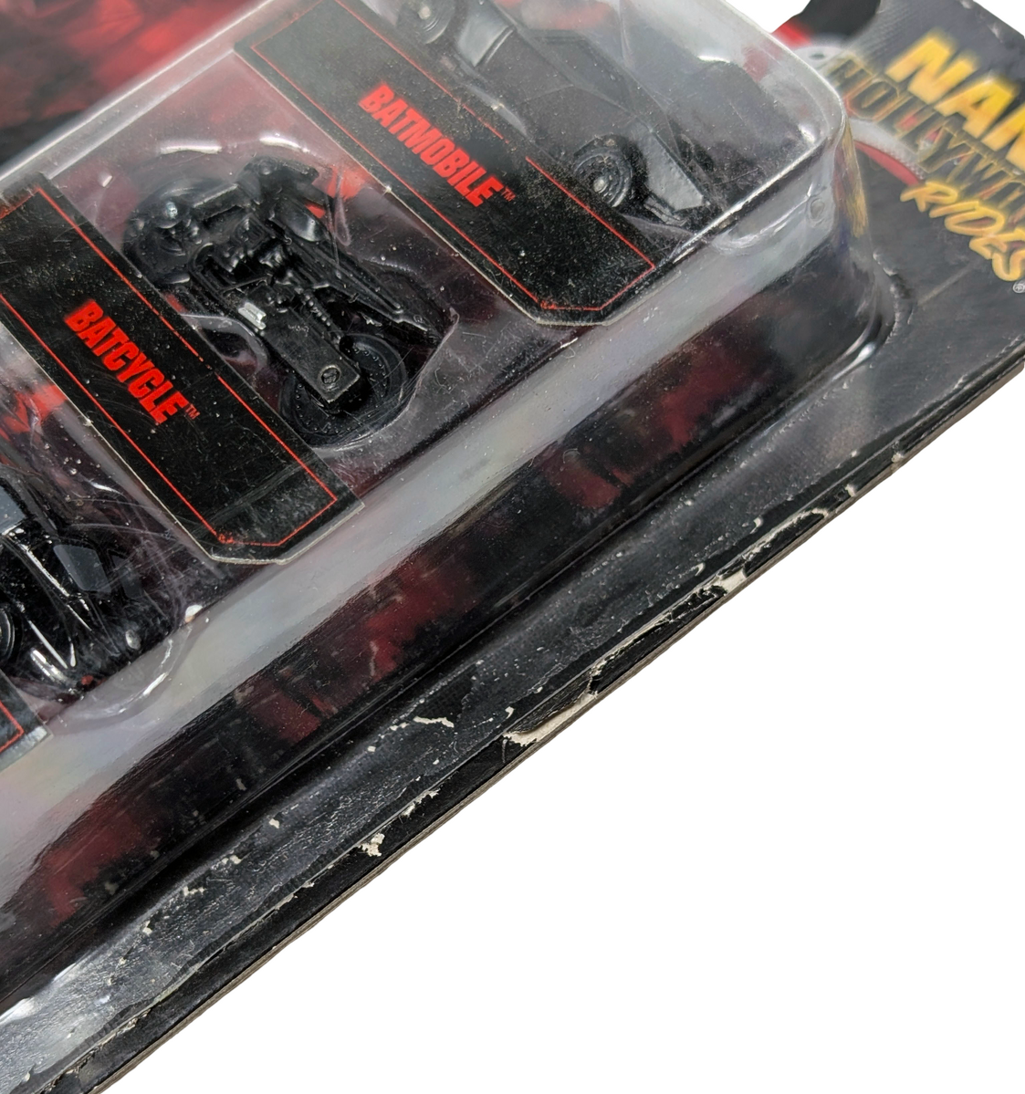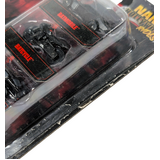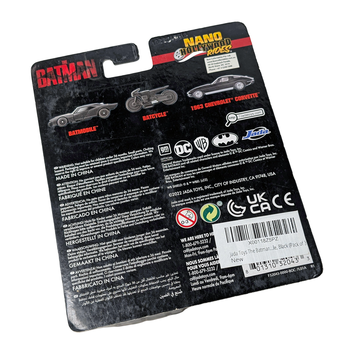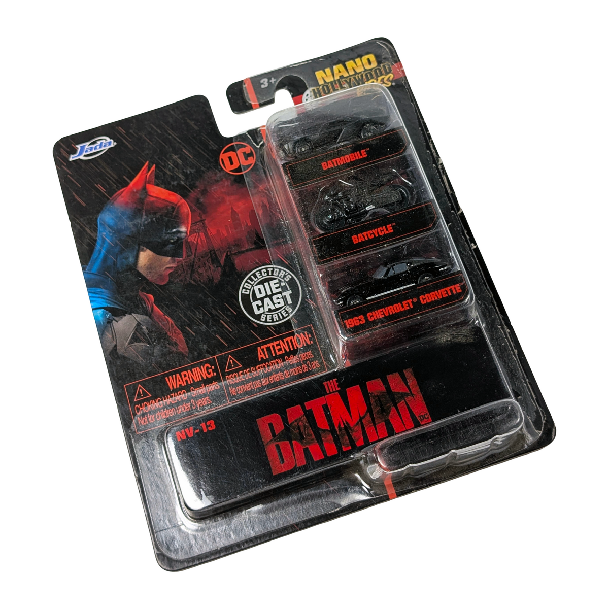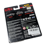 A display-friendly figure with strong visual presence. Condition notes: Multiple damage issues with packaging. This Jada Toys Nano Hollywood Rides set features a compact trio of vehicles inspired by The Batman, including the Batmobile, Batcycle, and a 63 Corvette. The Batman introduced a grounded, noir-inspired take on the character in 2022, with vehicle designs that quickly became a talking point among fans. With packaging damage noted, this set is best suited to collectors planning an open display rather than keeping it sealed.