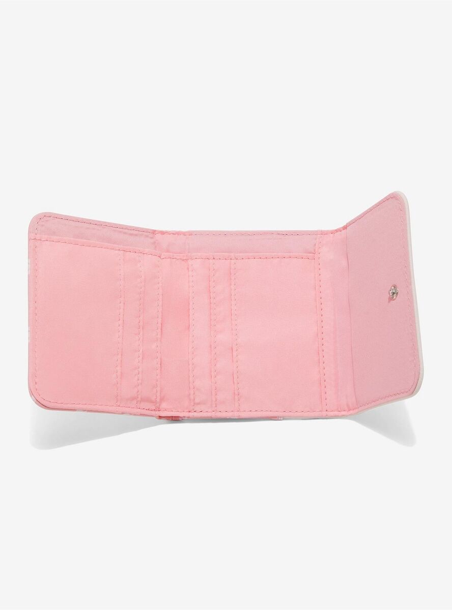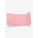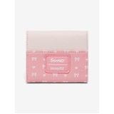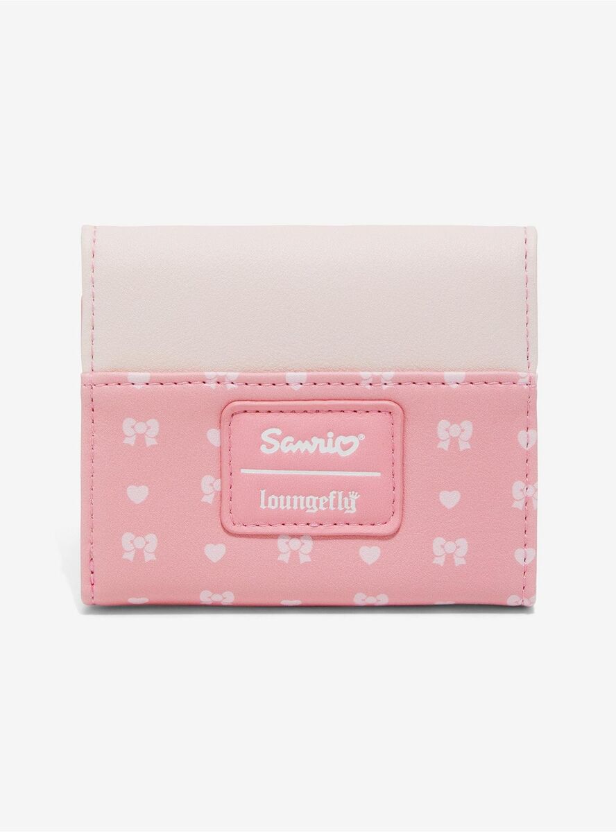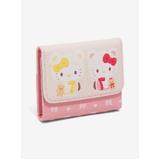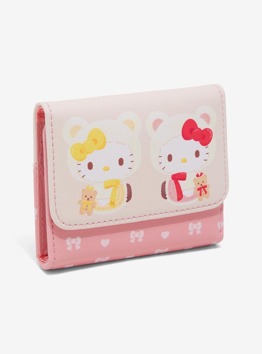This mini flap wallet features Hello Kitty and her sister Mimmy White, illustrated in matching teddy bear outfits alongside bows and heart details. Hello Kitty, one of Sanrio's most recognisable characters, appears here with her twin sister in a coordinated design that highlights their classic charm.