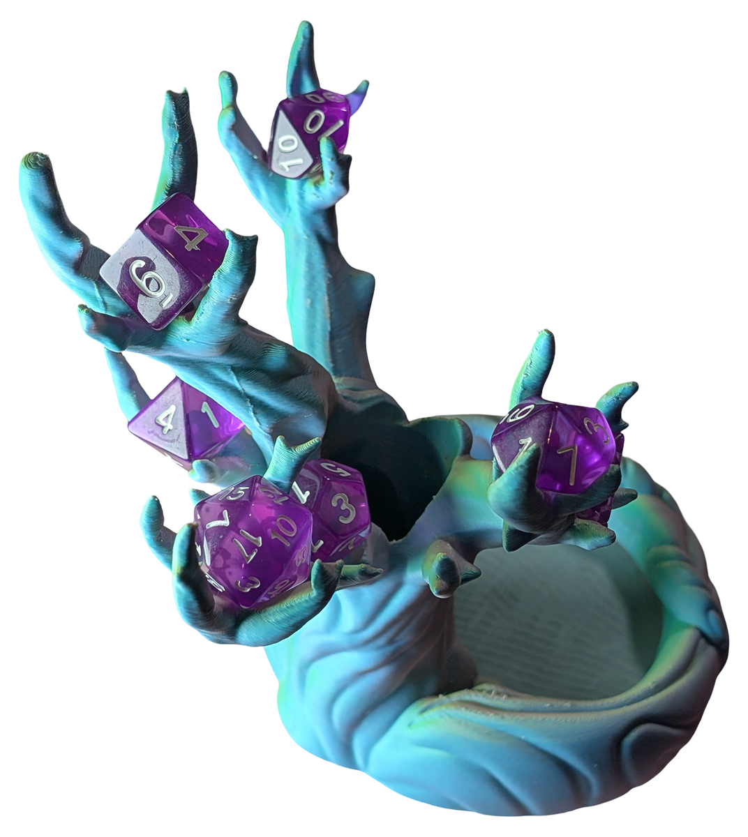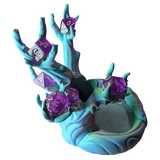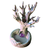 Enrich your gaming realm with the Ancient Grove Dice Tower & Holder, a uniquely designed accessory that brings the quiet majesty of nature to your tabletop. This intricately 3D-printed tower takes the form of a gnarled, leafless tree, its stark beauty hinting at ancient forests and whispered legends. The design subtly evokes the timeless symbolism of the Tree of Life, a perfect companion for your epic adventures. Look closely, and you'll discover a young dragon subtly camouflaged within the tree's branches, patiently observing your game. Integrated within its sprawling branches are seven designated locations, perfectly cradling your standard polyhedral dice set, ensuring they're always organised and ready for adventure. Below, the tree's robust "ground-roots" form a secure, integrated dice tray, neatly containing every roll.