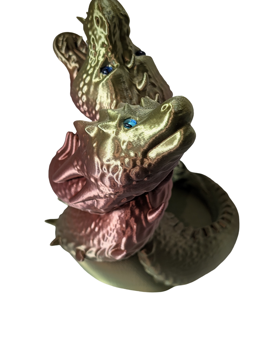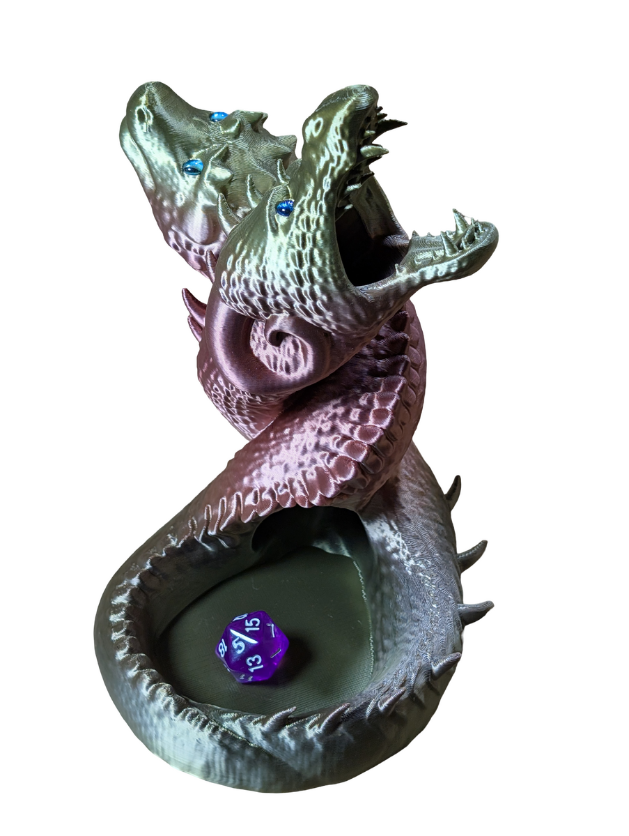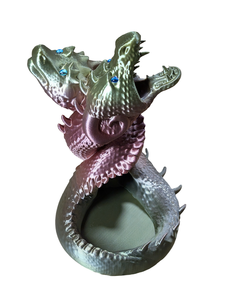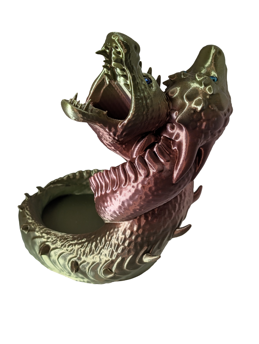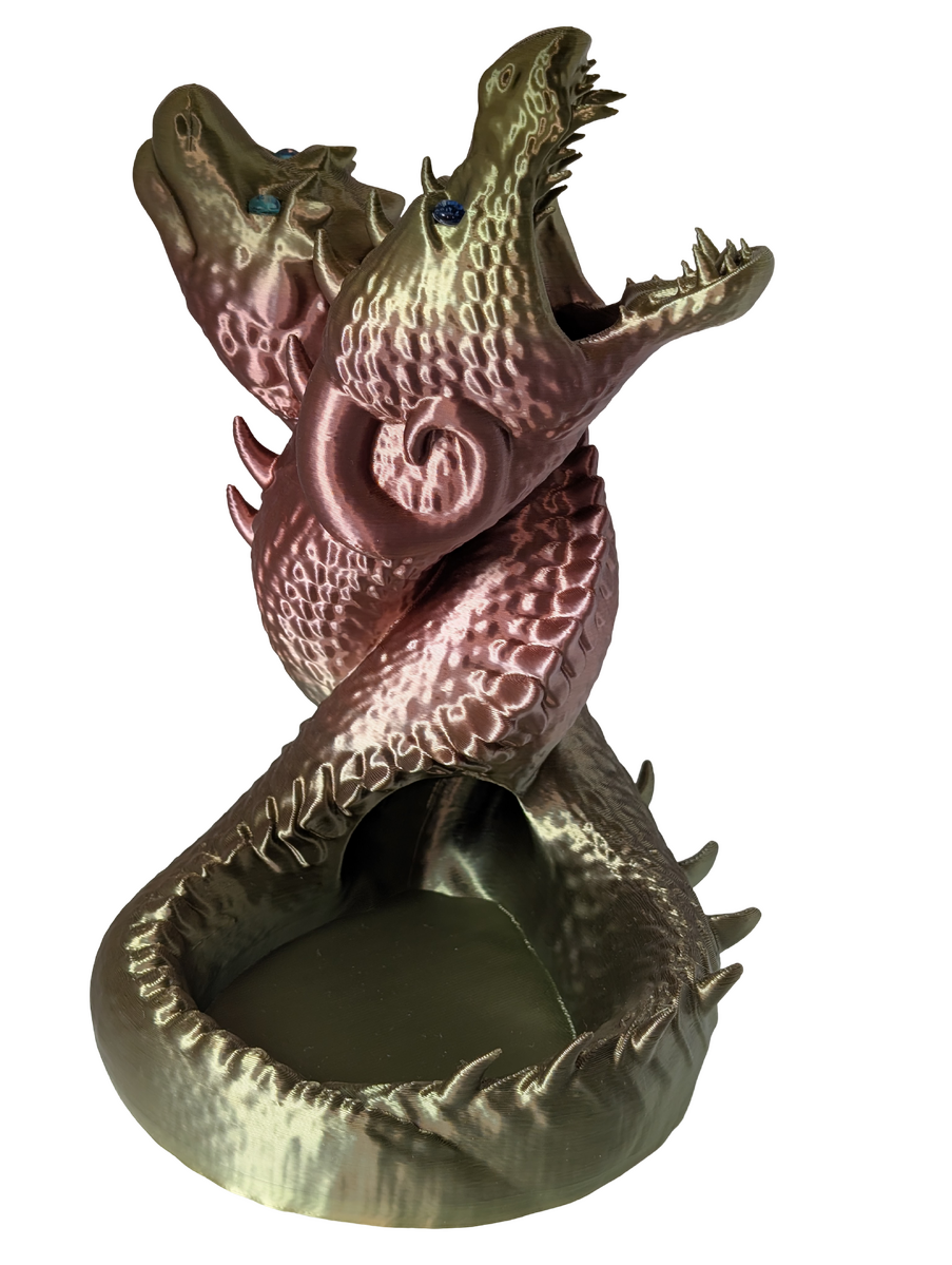 Bring mystical elegance to your game night with the Twin Dragons Dice Tower, a breathtaking 3D-printed accessory. Unlike battling beasts, these two majestic dragons are gracefully intertwined, their forms flowing together to create a unified and captivating structure that symbolises harmony on your gaming table. This exclusive edition is crafted with a mesmerizing Bronze Rainbow Silk gradient filament. The premium metallic finish shimmers, shifting through rich bronze hues to subtle rainbow colors as you move it, making every piece a unique focal point.