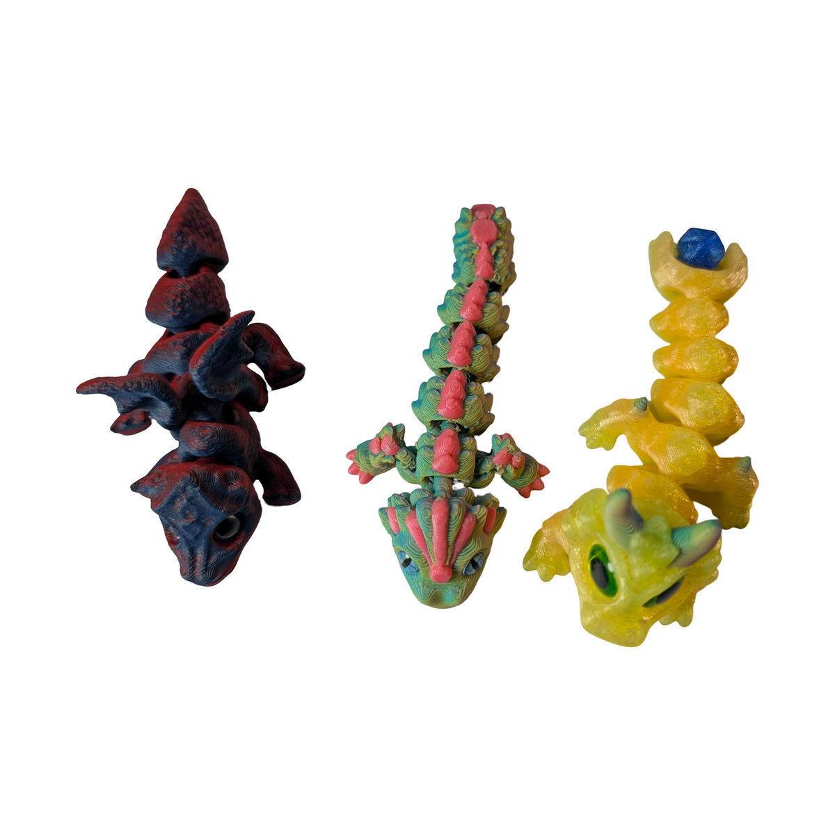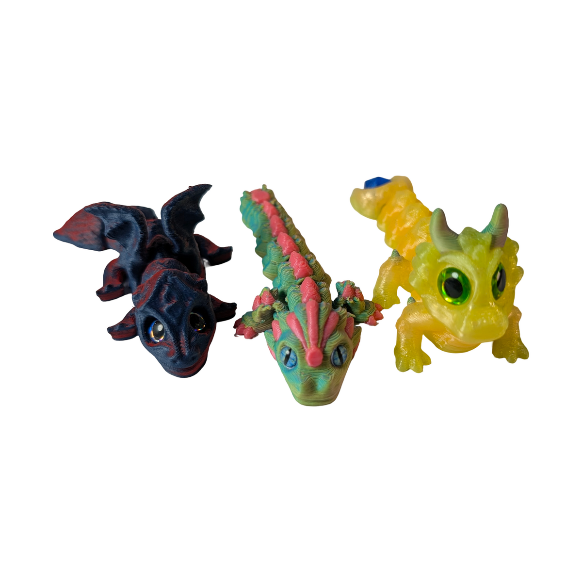 This baby dragon keyring and bag charm multi-pack includes three clearly defined designs: Baby Divine Dragon, Baby Frankie Dragon, and Baby Gemstone Lizard Dragon. Each piece is 3D printed in multi-colour PLA with articulated details and hand-applied eyes, giving every little dragon its own personality. Supplied as a fixed set, this pack is ideal for gifting or collecting, with no mystery about what's included.