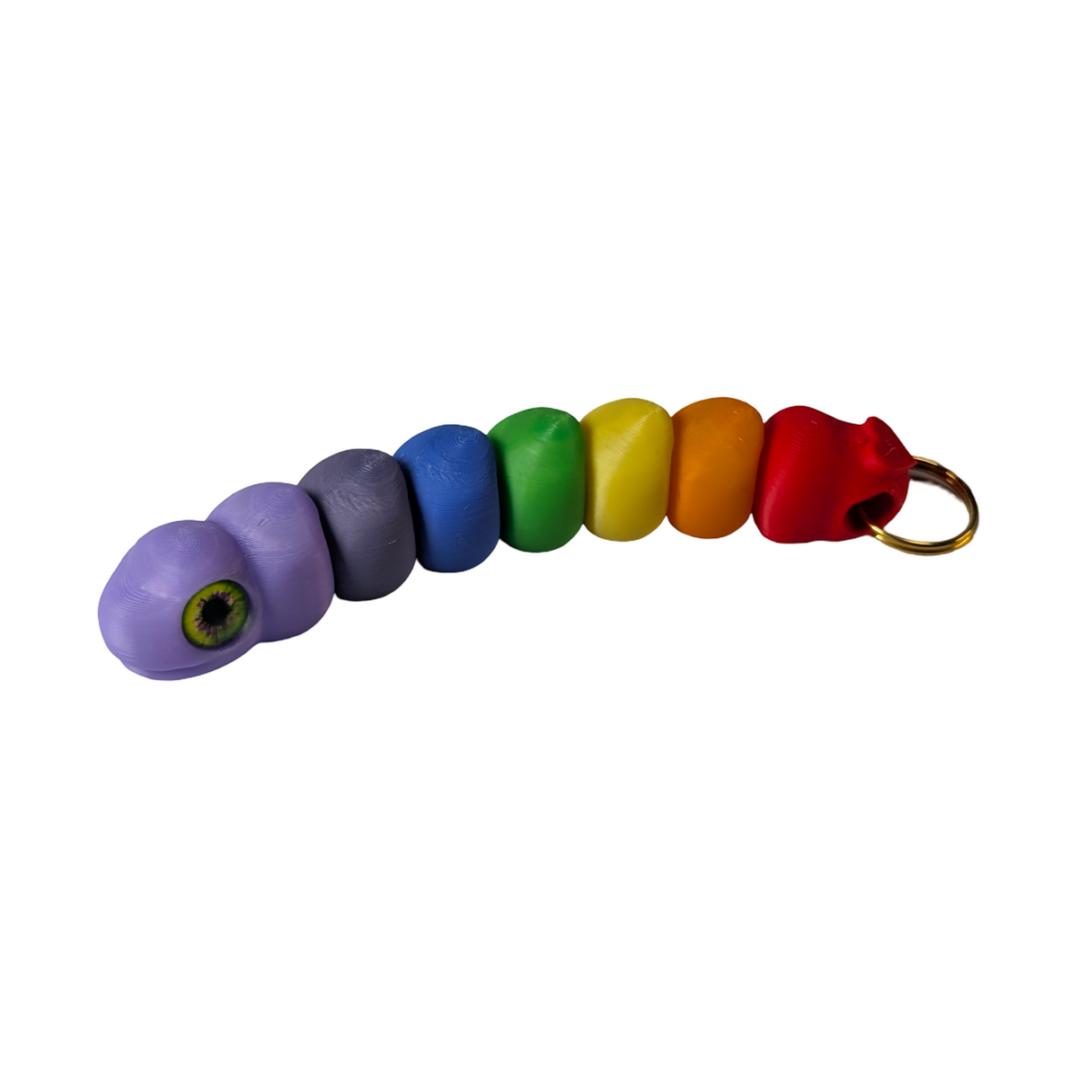 Worms... but make it custom..This Build-A-Worm keyring and bag charm is an articulated 3D printed figure made from matte PLA, with hand-applied eyes and a bright multi-coloured finish. The fun part? The body separates into different colour segments, letting you rearrange the order to create your own rainbow worm. Lightweight, flexible, and endlessly fiddly, it's a playful companion for keys, backpacks, or bags. Build it your way, then clip it on. From Australia.