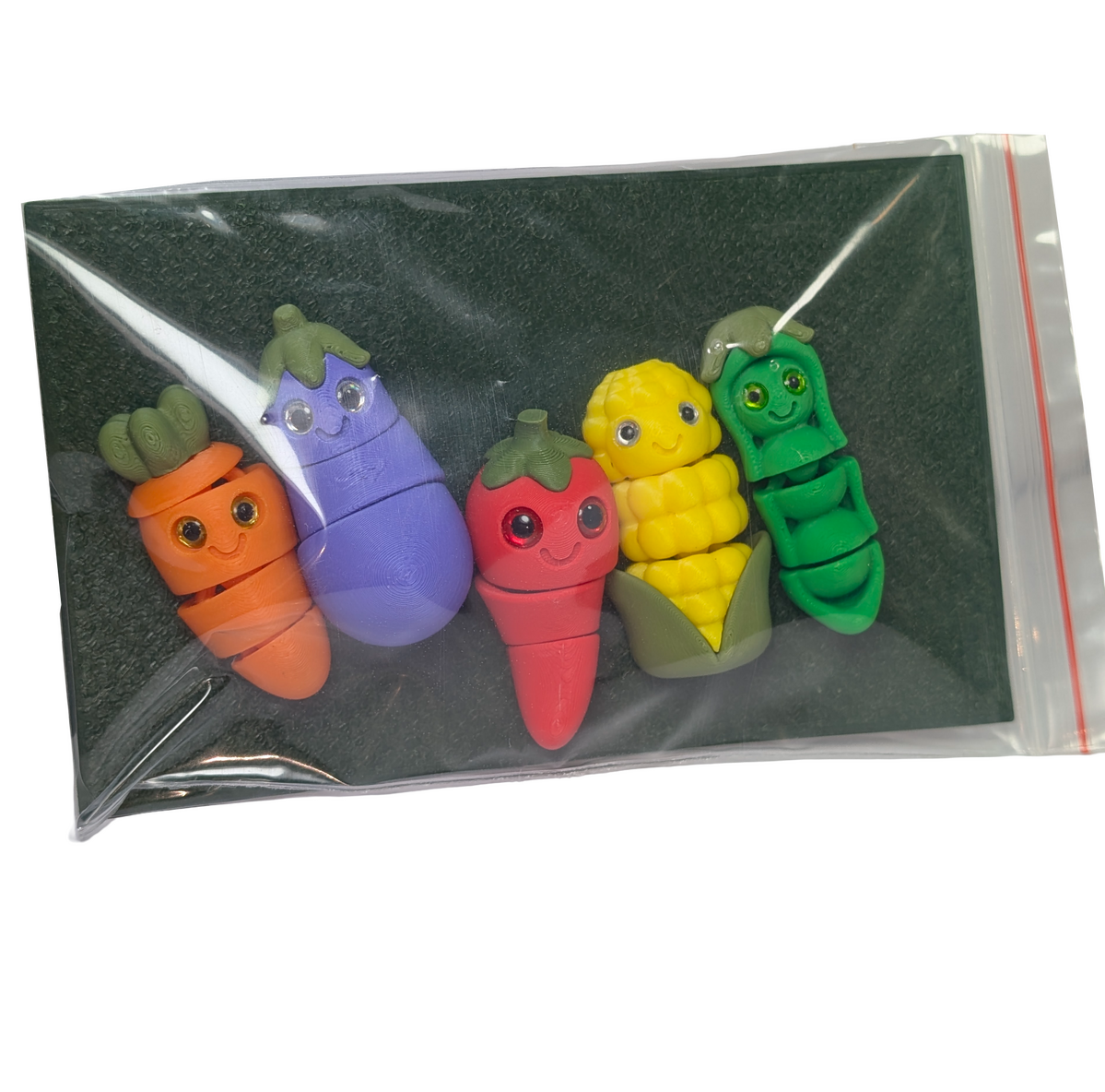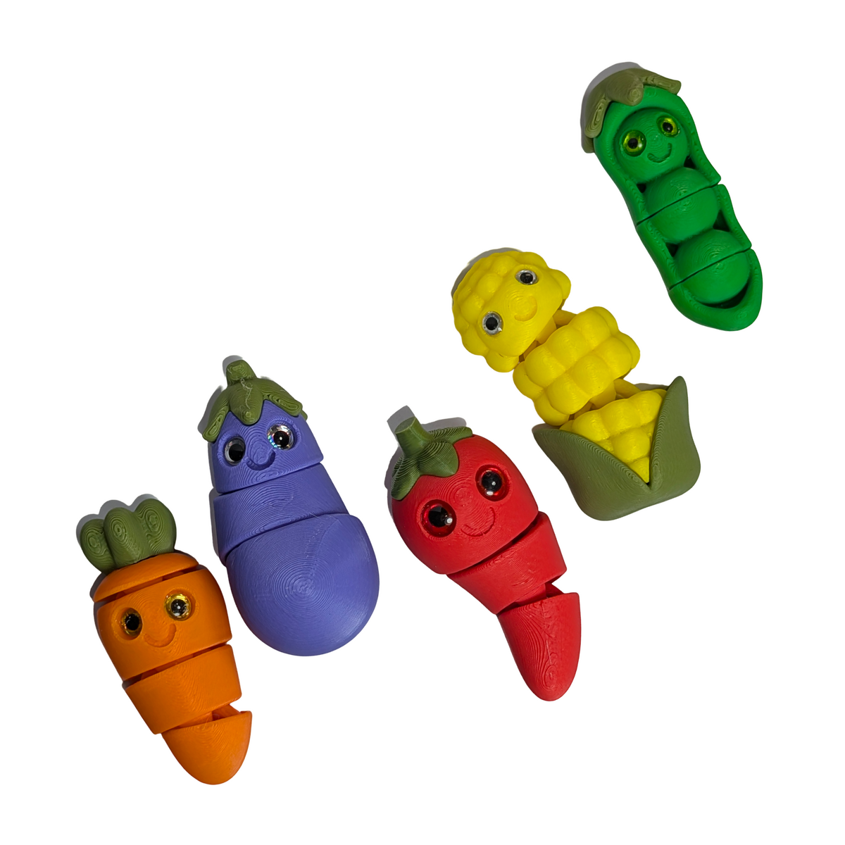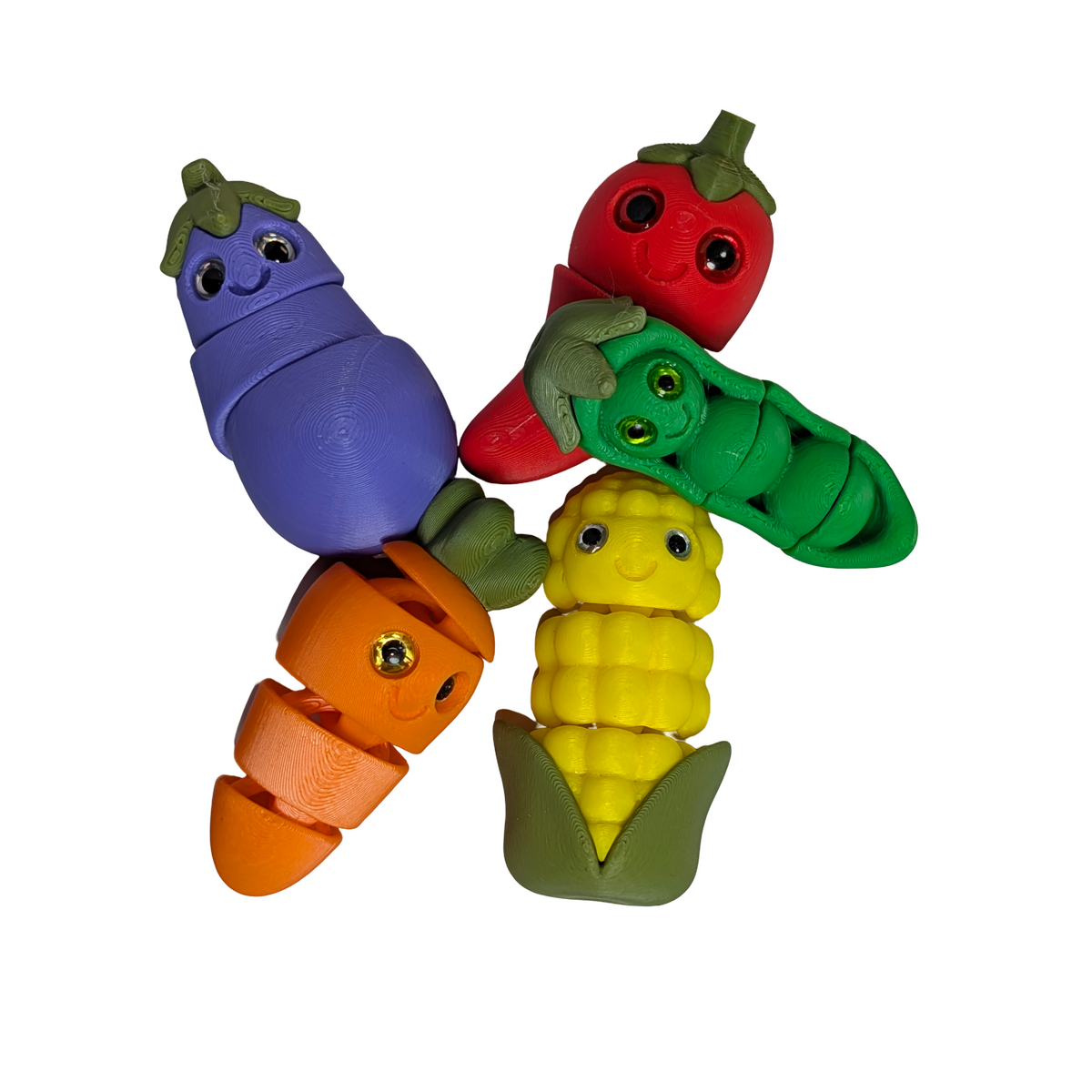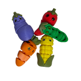 This Crispy Crew Vegetable magnet set from the Garden Gang series features five articulated chibi-style produce characters, including a carrot, eggplant, corn, chilli pepper, and pea pod. Each piece measures approximately 50 mm in length and includes 2 or 3 points of articulation for added character and poseability.