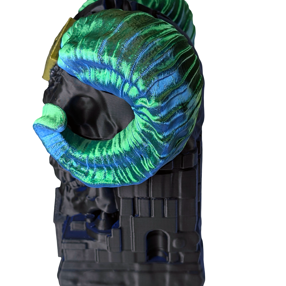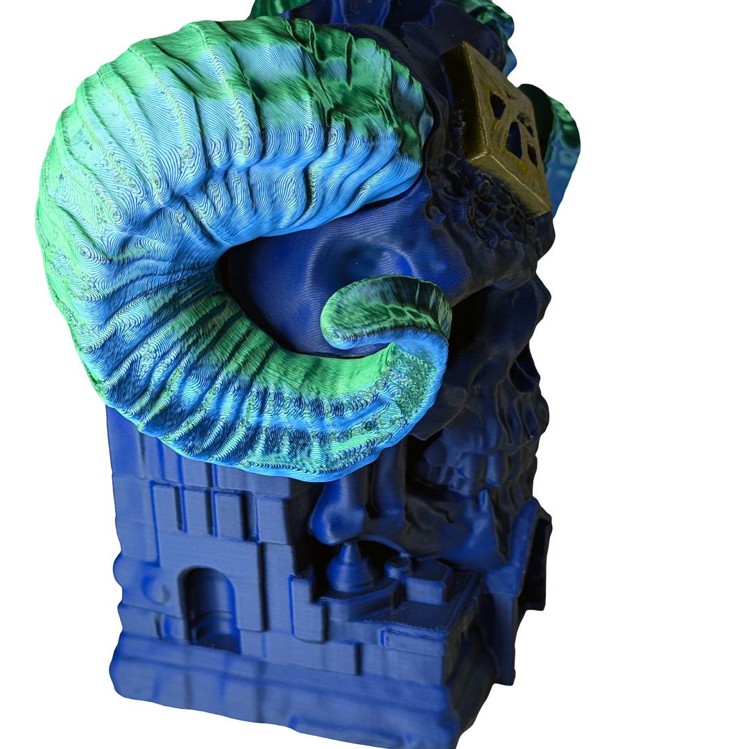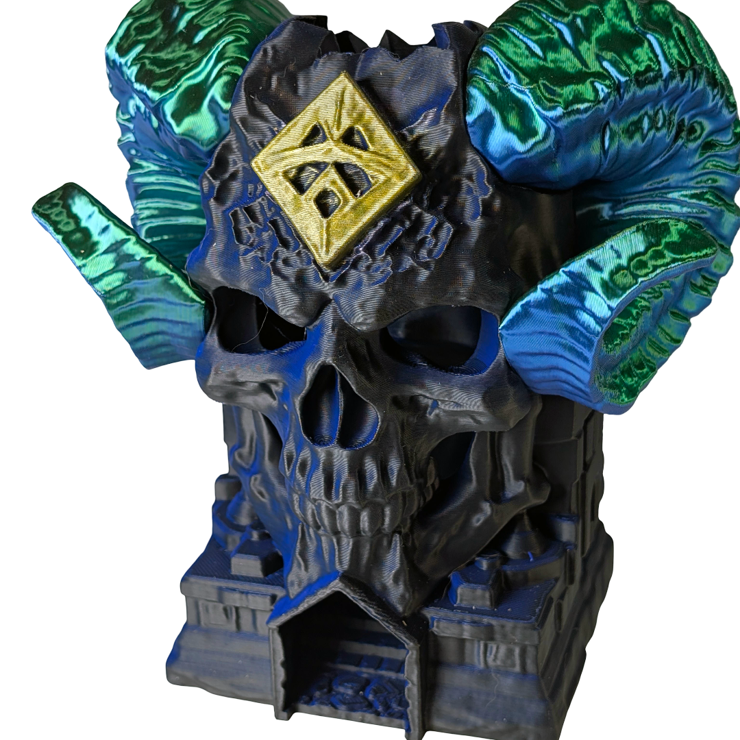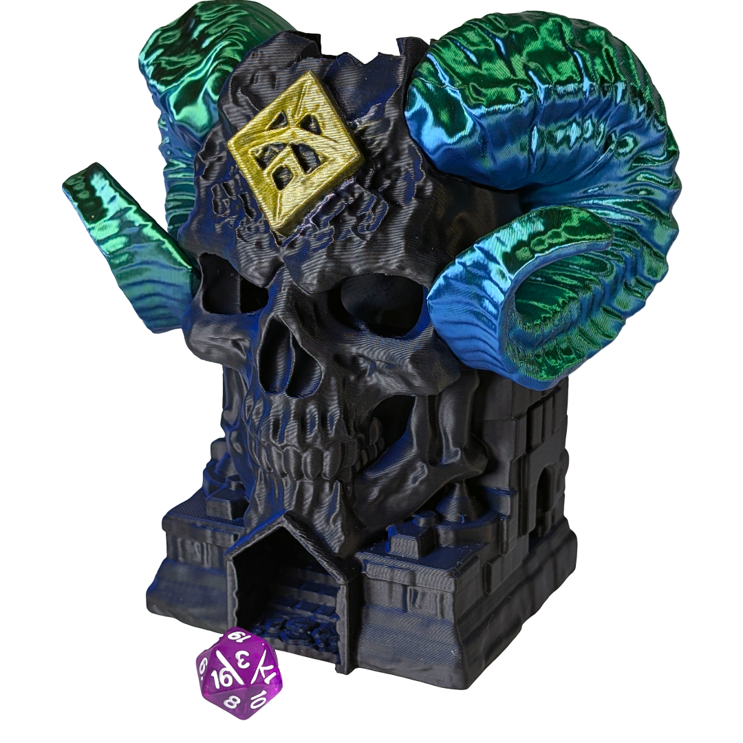 Dark, dramatic, and made to loom over the table, the Demon Skull Mountain Dice Tower brings a bold fantasy presence to your game nights. Designed to guide and randomise dice rolls, it also works as a striking display piece between sessions. 3D printed in PLA and finished by hand, each tower features detailed sculpting and carefully applied finishing touches. With its slow rolling action and imposing design, it's well suited to tabletop role-playing games and board games that appreciate a bit of atmosphere.
