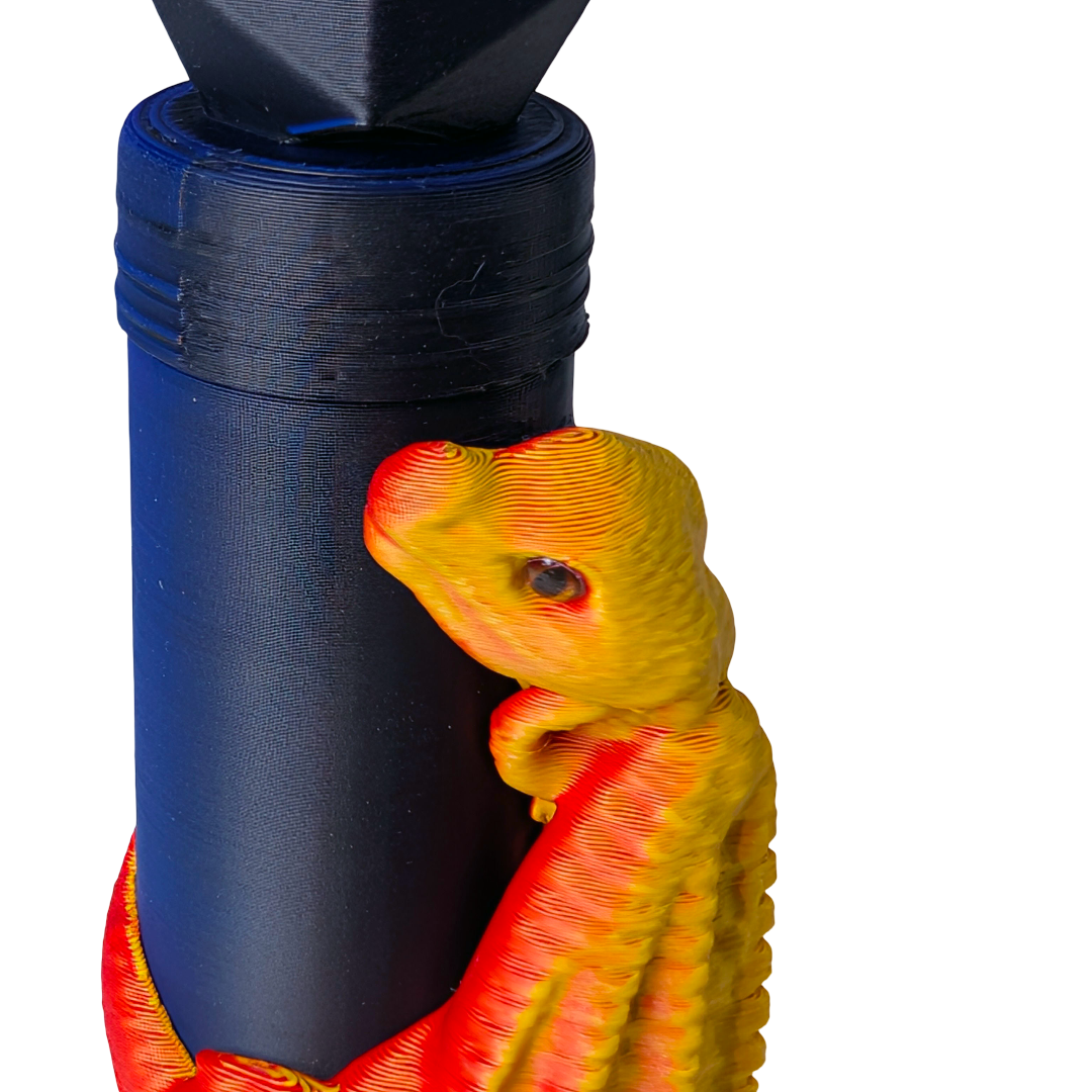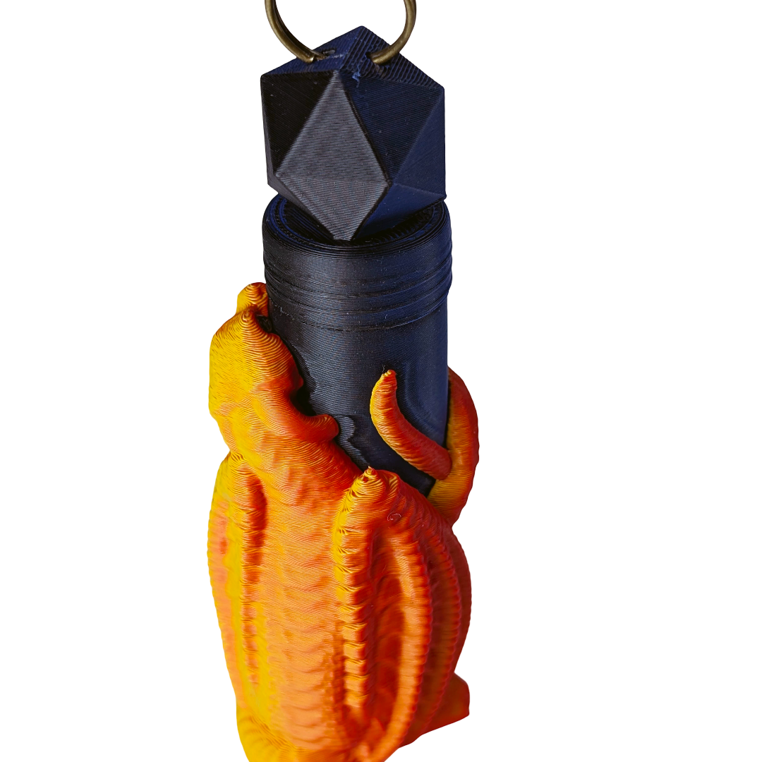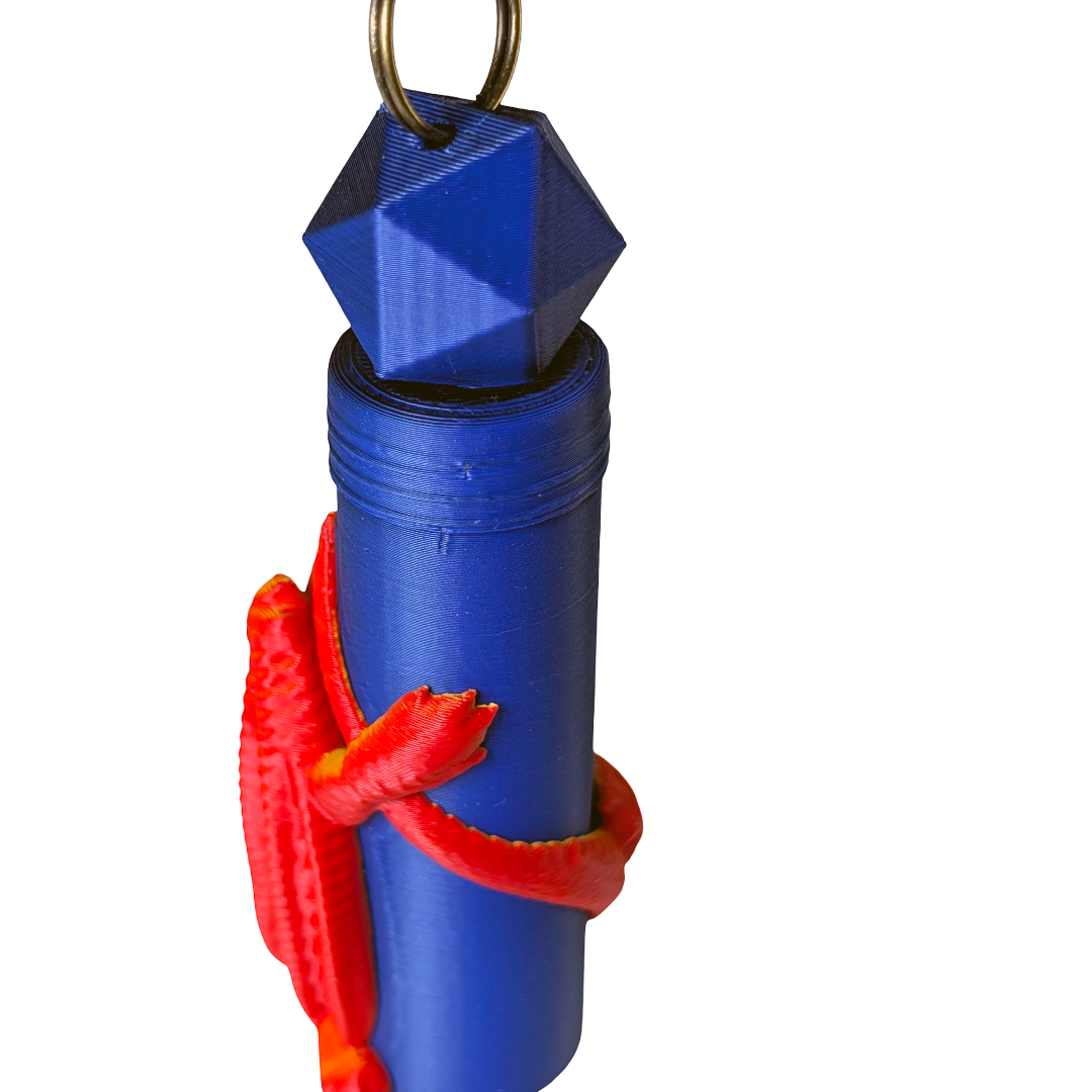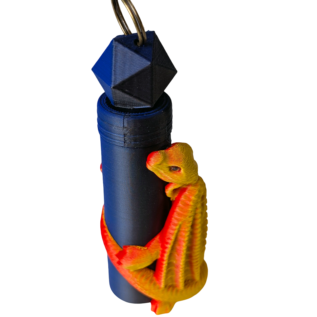 Never lose your lip balm to the depths of your bag again. This Dragon Lip Balm Holder keeps it safe under the watchful eye of a not-so-ferocious dragon, finished in bold orange, red, black, and blue tones. 3D printed in lightweight PLA, it fits standard-sized lip balm tubes and features a threaded lid to keep everything secure. The built-in keychain attachment makes it easy to clip onto keys, backpacks, or lanyards, so it's always right where you need it.