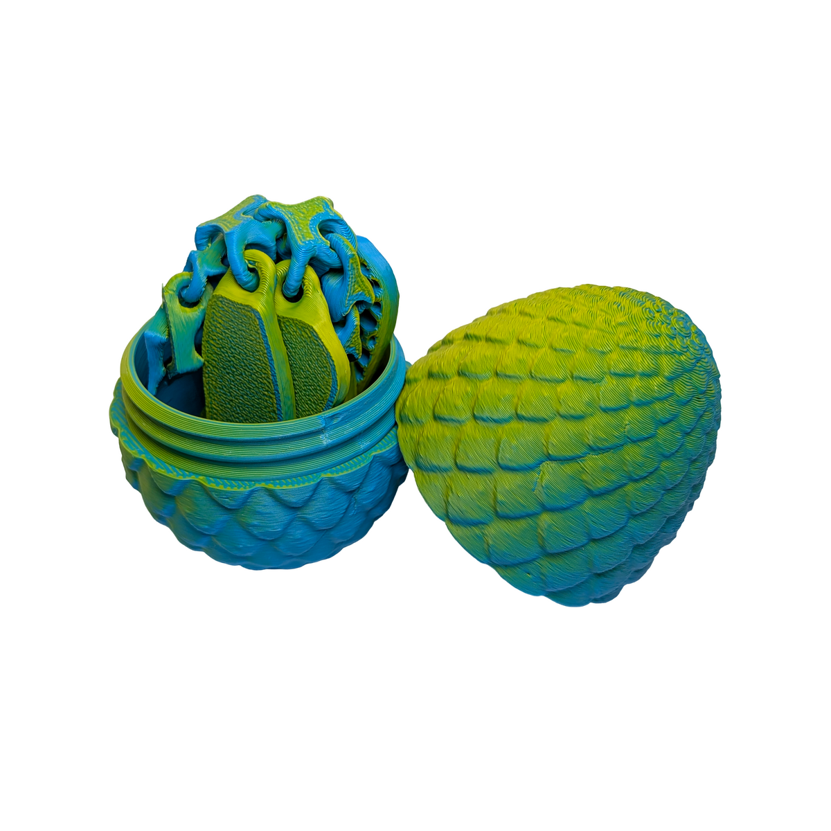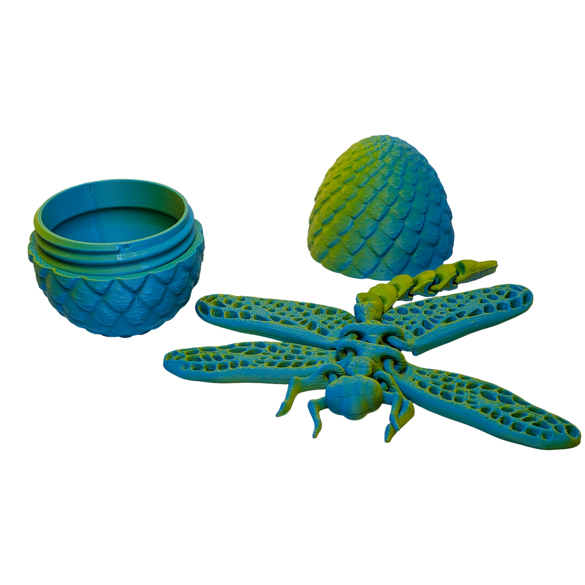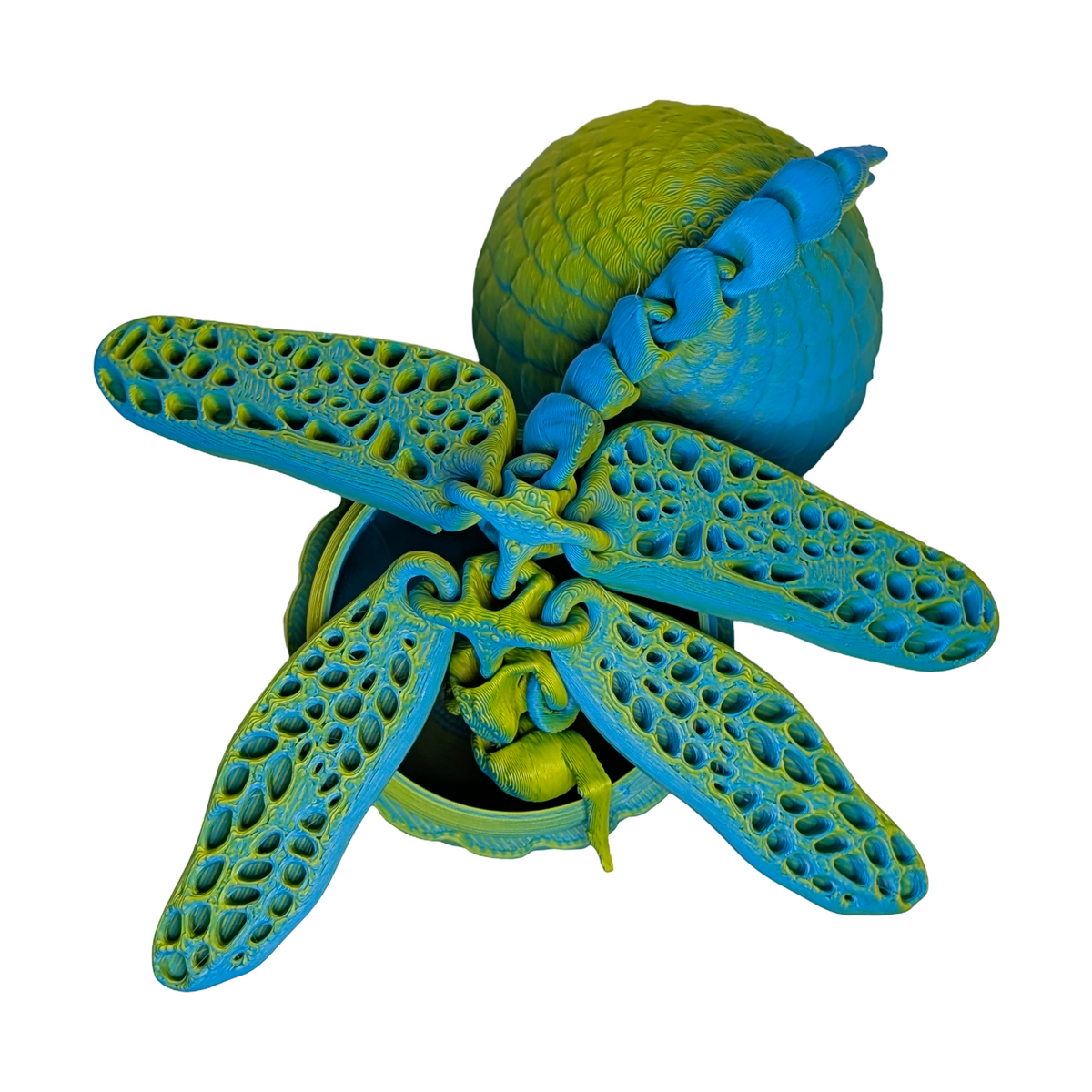 A design-focused piece produced using contemporary printing methods. The Gossamer Gliders: Mythic Dragonfly Egg playset brings a vibrant pop of colour to your collection with its striking yellow and cyan finish. This medium-sized set includes a dragonfly with 15 points of articulation, measuring 115x110x10mm, allowing for lifelike posing and interaction. The set is completed by a threaded egg that assembles to 51x51x66mm, providing a secure and stylish home for your mythic glider. From Australia, these handmade pieces are crafted from lightweight PLA with a high-detail matte finish. Designed by KEKreations and handmade by Supportive Solutions in Australia.
