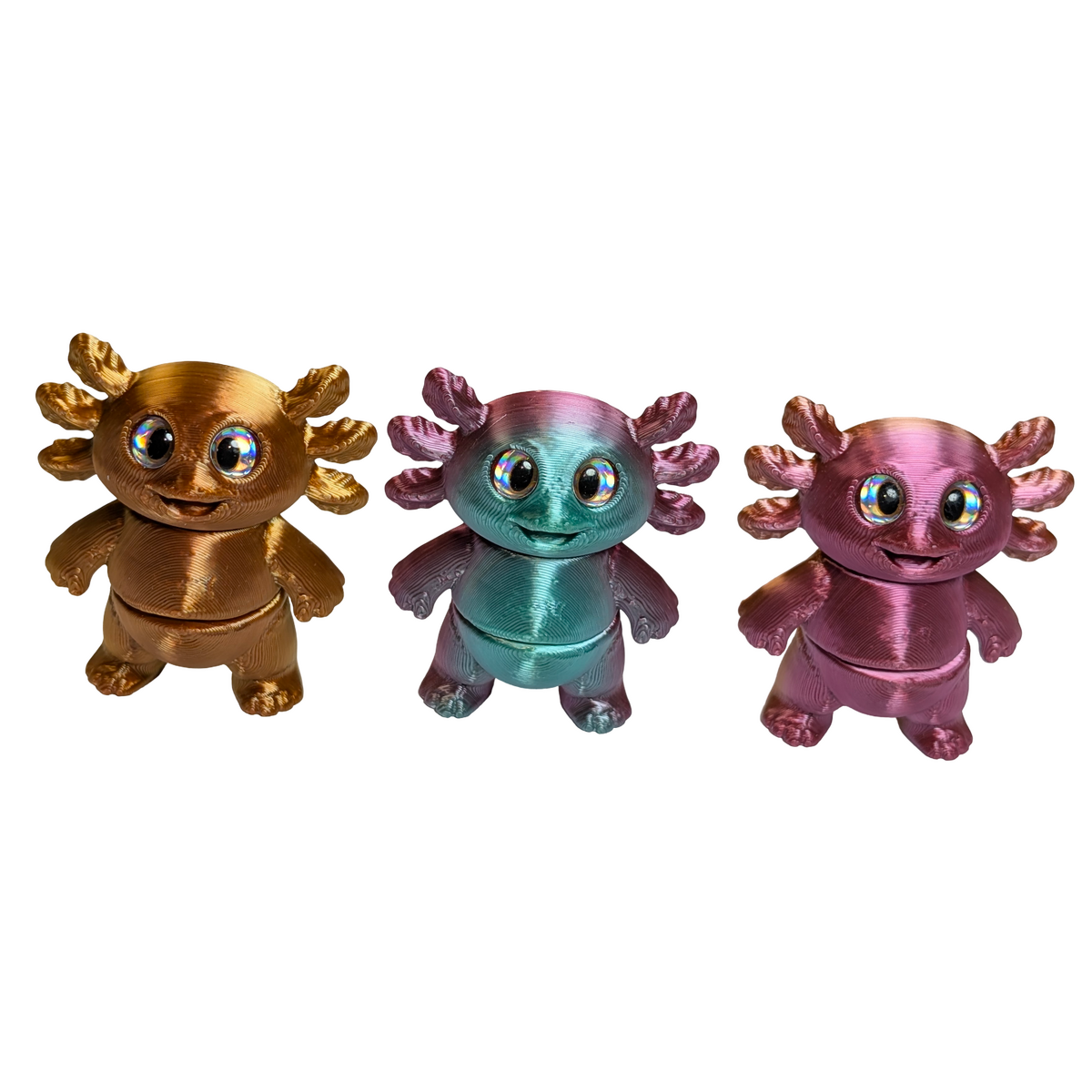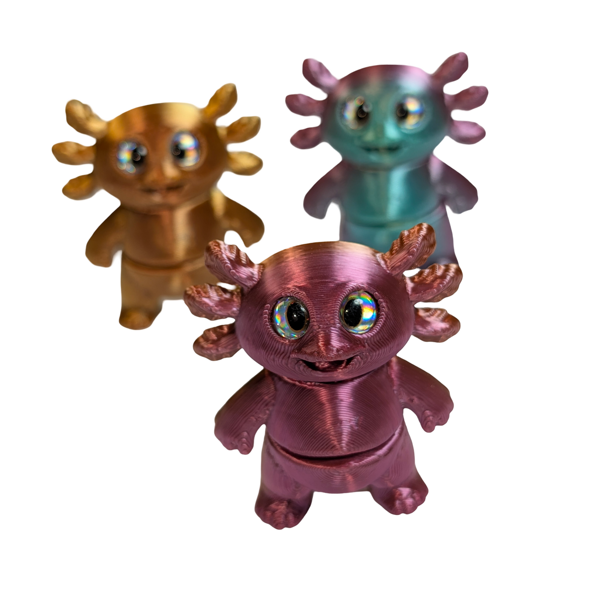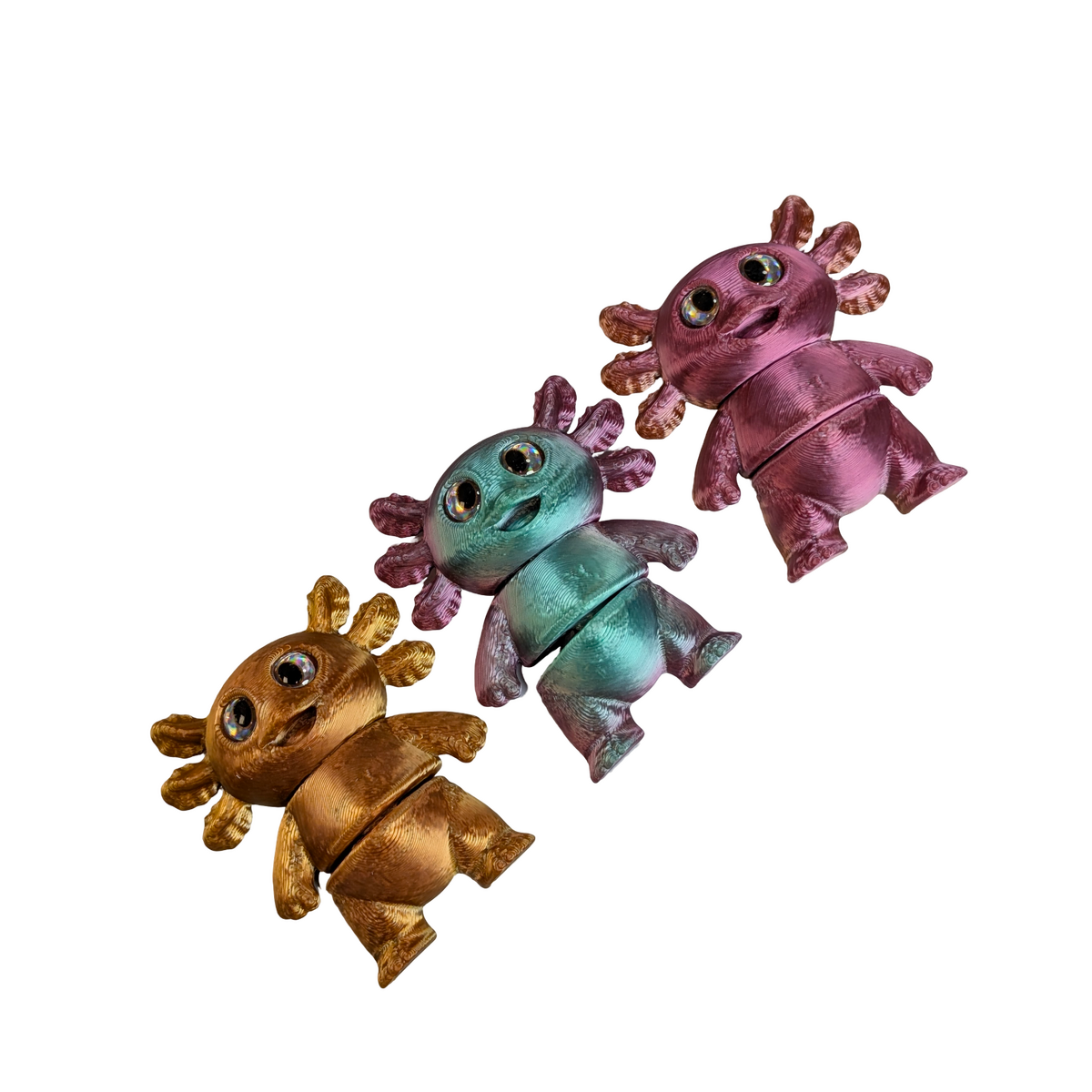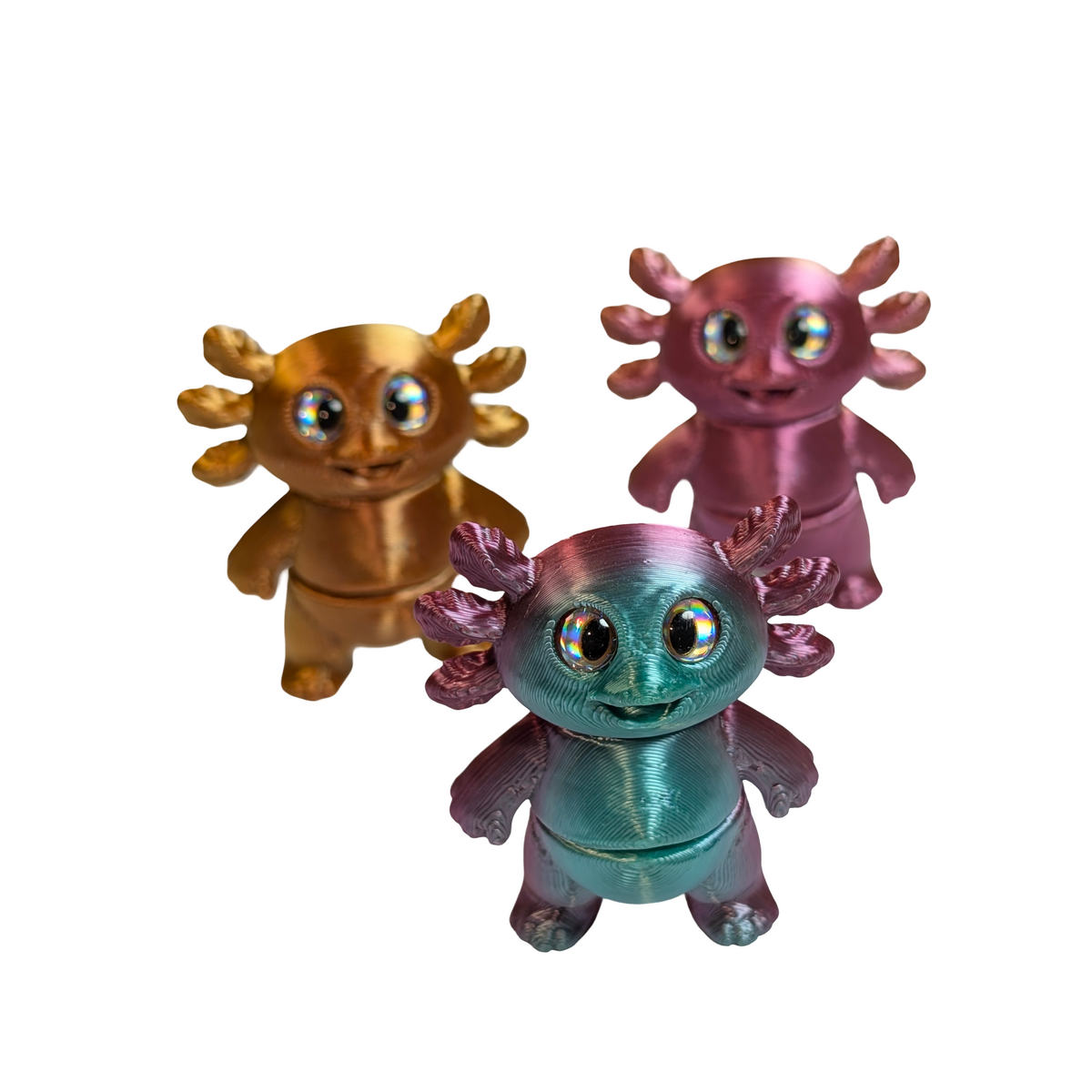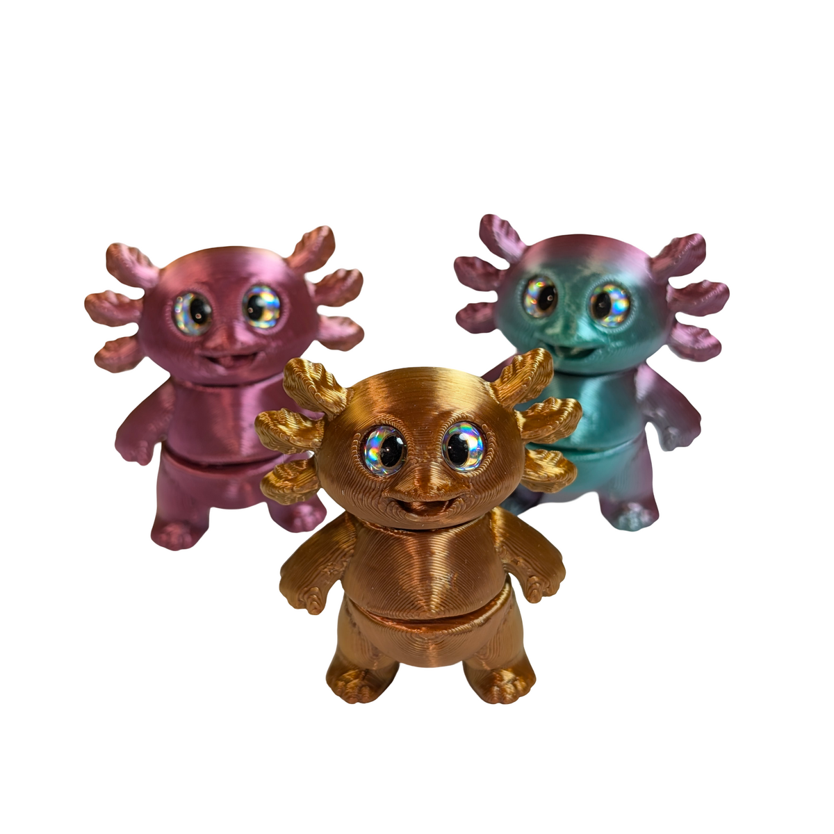 This set includes three articulated axolotl magnets, each finished in a multi-coloured silk PLA for a smooth, slightly reflective appearance. With two points of articulation, each piece offers gentle movement and can also stand freely when not in use. Axolotls are known for their distinctive look and regenerative abilities, making them a unique addition to wildlife-inspired collections.