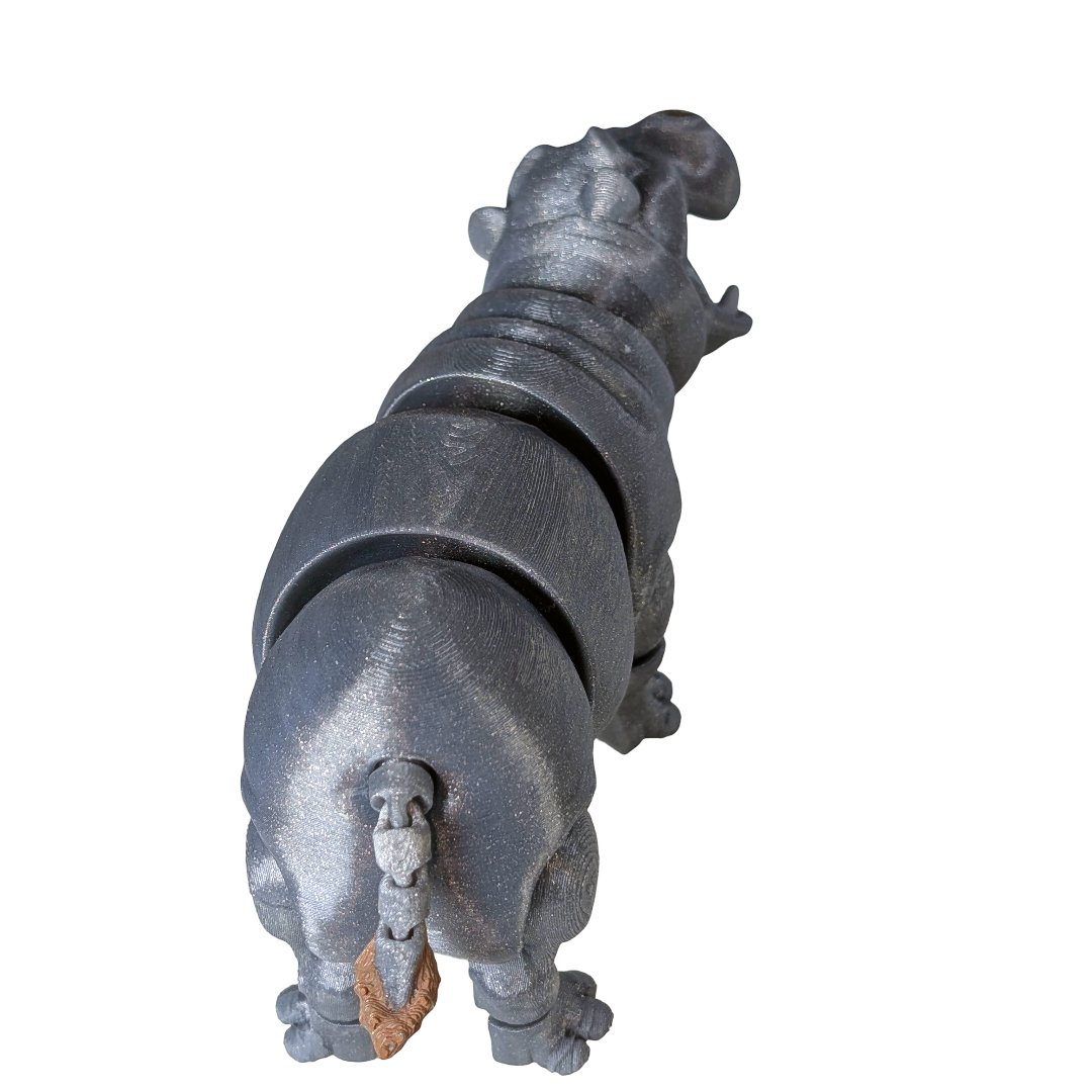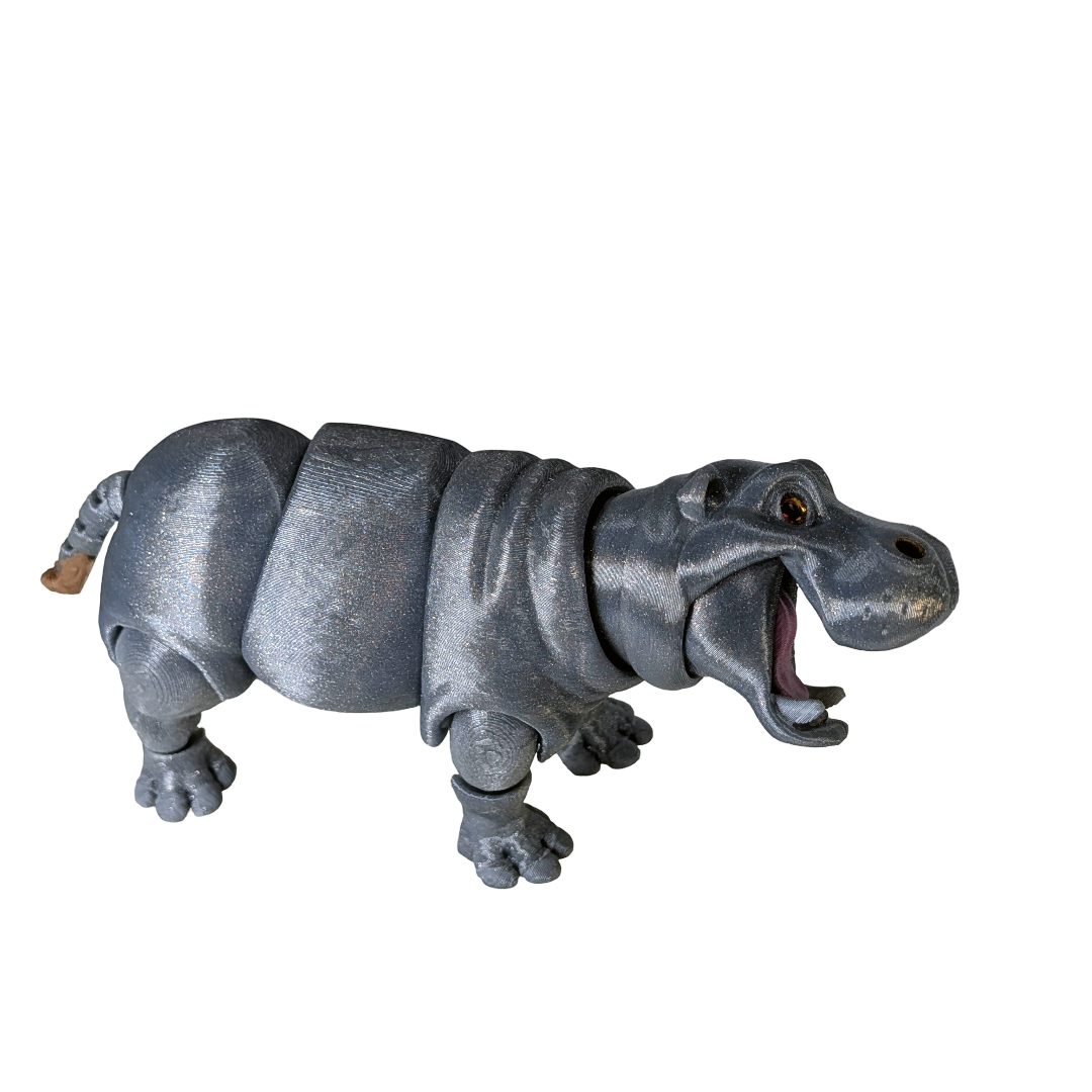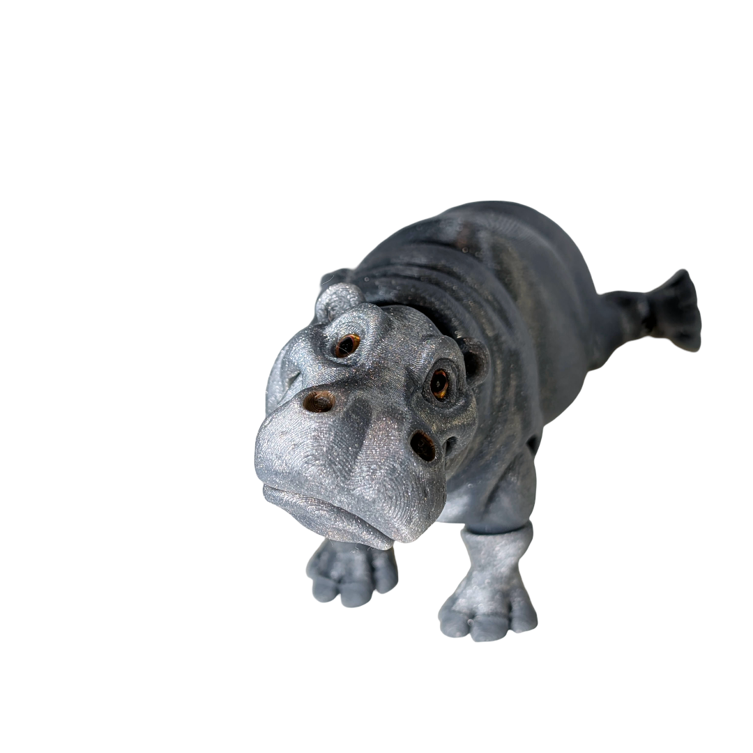 Compact but full of character, the Hippopotamus Figurine brings a touch of wildlife charm to shelves and desks without demanding much space. Designed as a decorative display piece, it features a realistic form with articulated joints that allow for gentle repositioning. 3D printed in PLA with a sparkly silver finish, each figurine is finished by hand and includes hand-painted details and carefully applied artificial eyes. A great choice for wildlife collections, desks, or smaller display spaces.