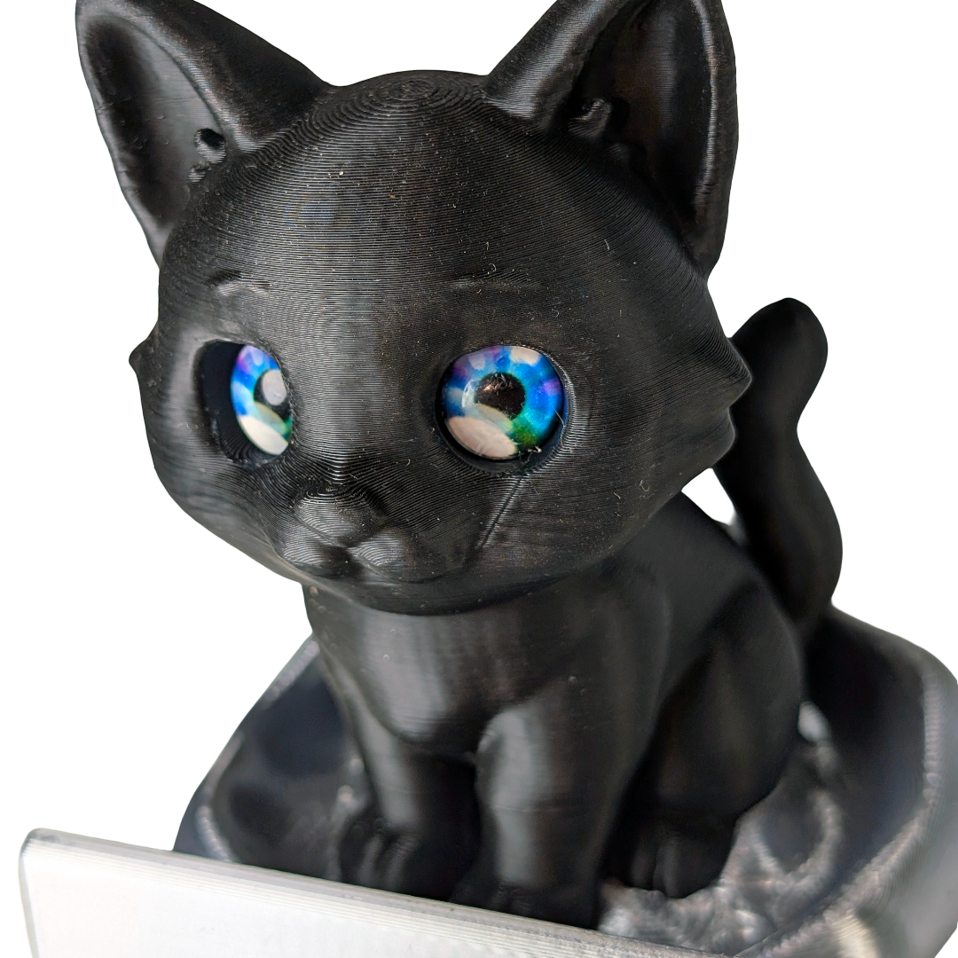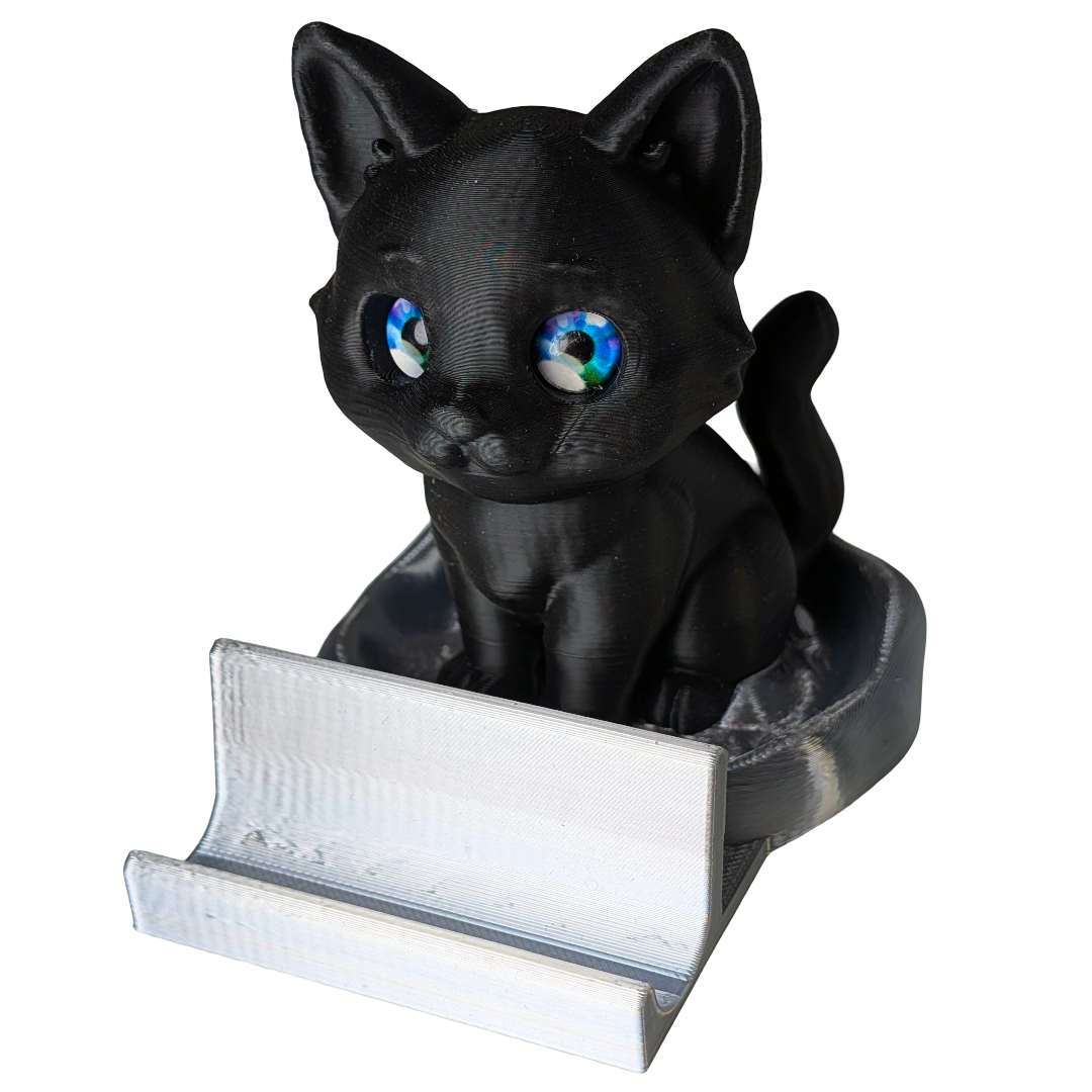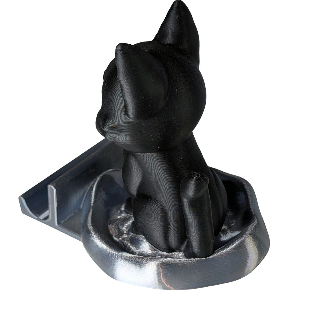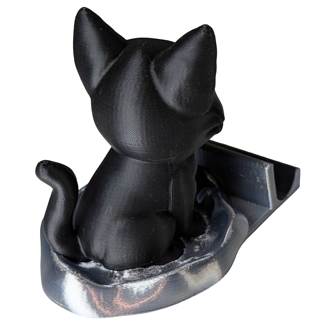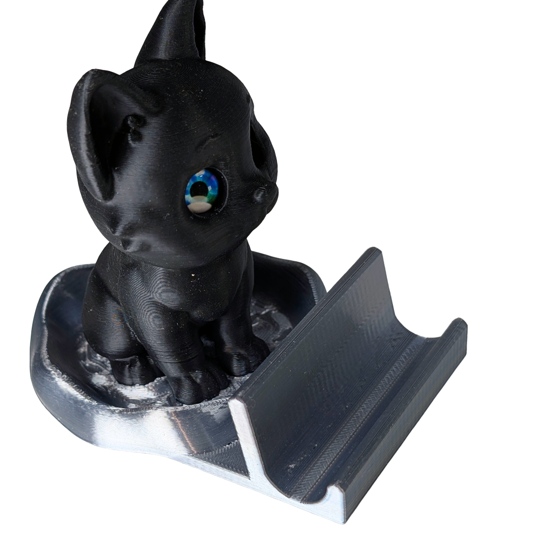 The Kitten Phone Stand brings a calm, slightly classy twist to cute desk accessories. Shaped like a curious little kitten, it keeps your phone upright while adding a subtle decorative touch to your space. 3D printed in lightweight PLA with a black and silver finish, this stand is compact, sturdy, and easy to place on a desk, bedside table, or counter. Ideal for video calls, scrolling, or keeping your screen visible while you work, study, or relax.