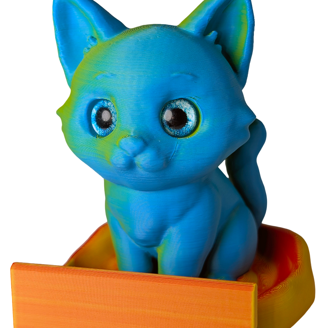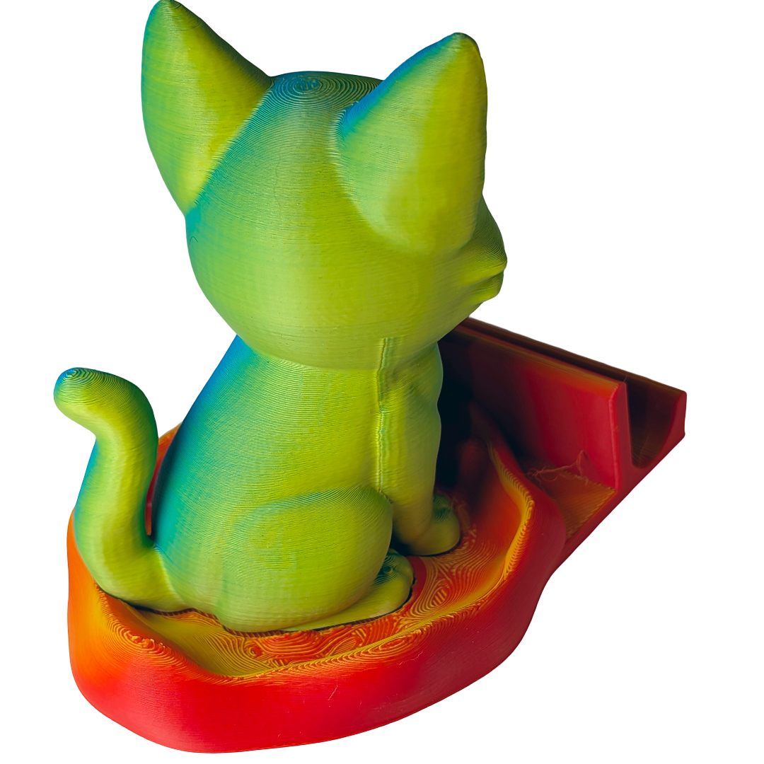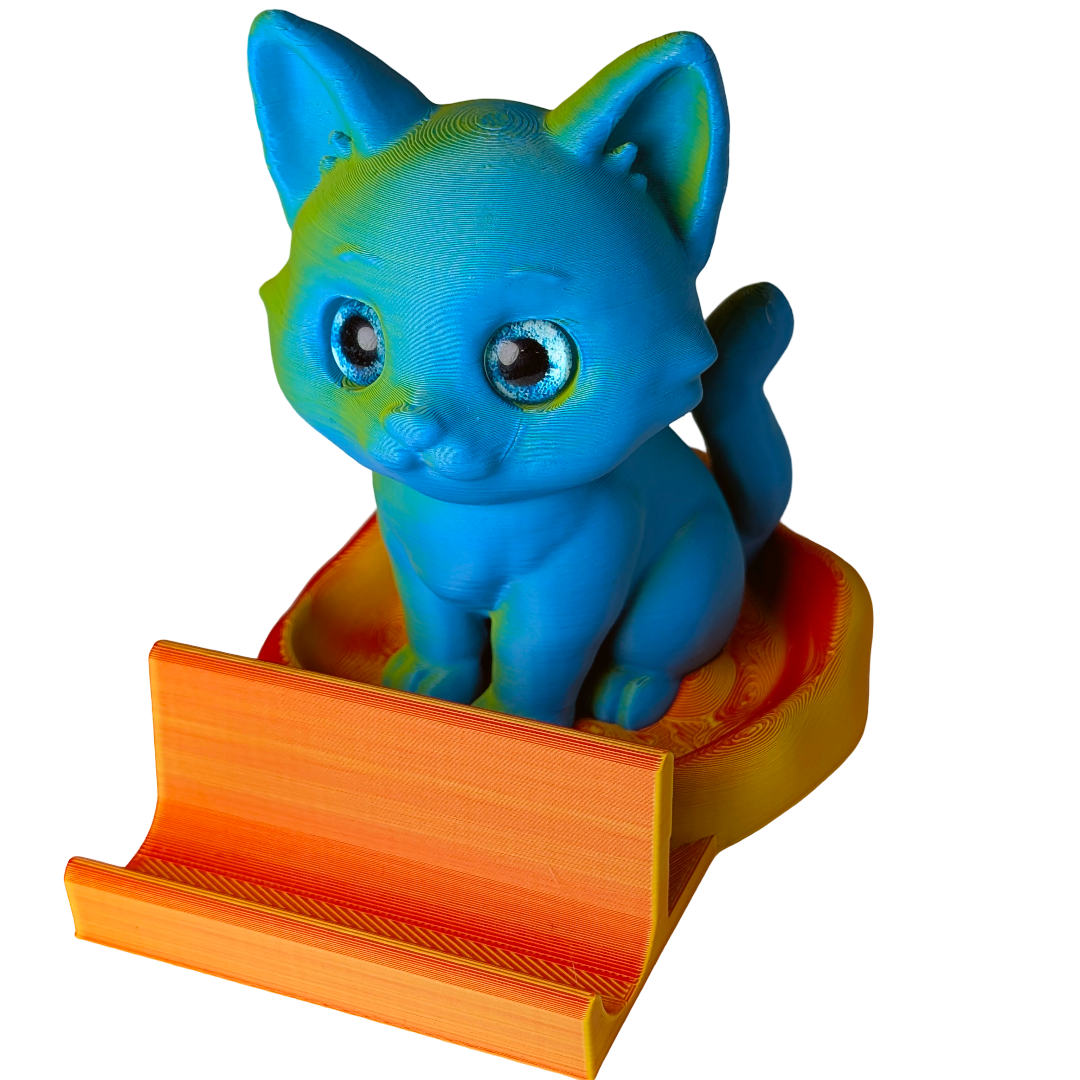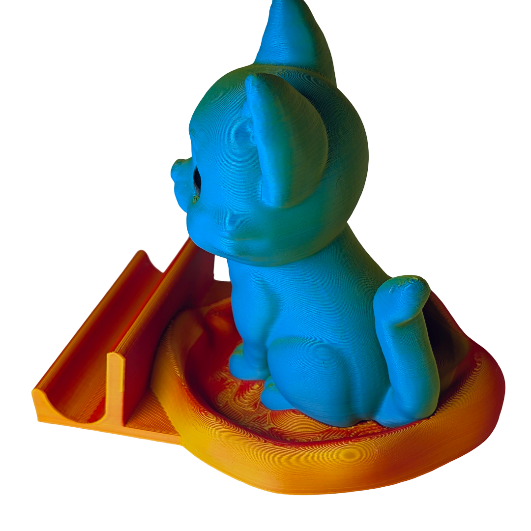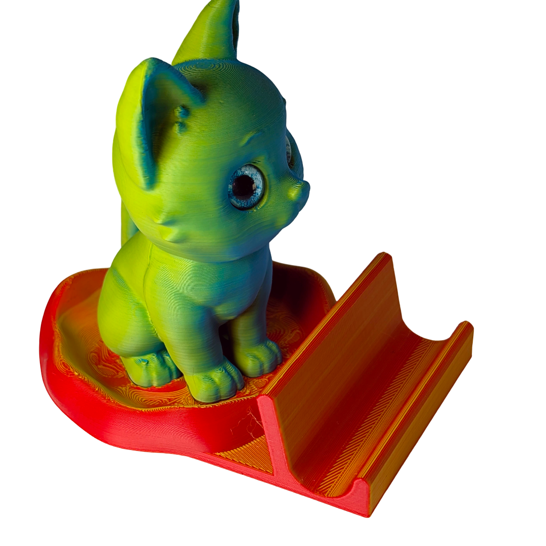The Kitten Phone Stand is a small desk companion with plenty of personality. Shaped like a playful kitten, it keeps your phone upright while adding a bright splash of colour to your space. 3D printed in lightweight PLA with dual colour matte finishes in cyan and yellow, and orange and red, this stand is compact, sturdy, and easy to place wherever you need it. Ideal for video calls, scrolling, or keeping your screen visible while you work, study, or relax.