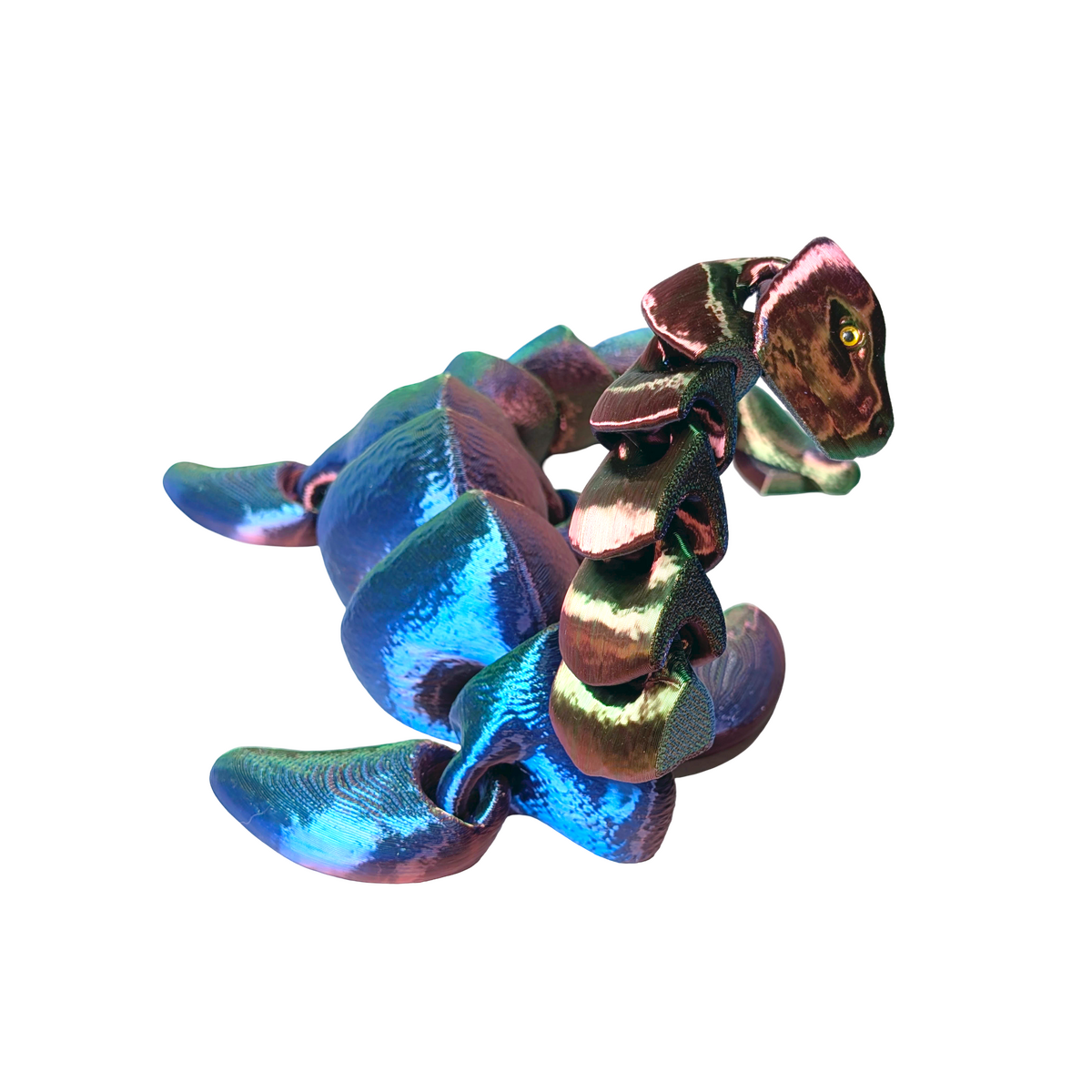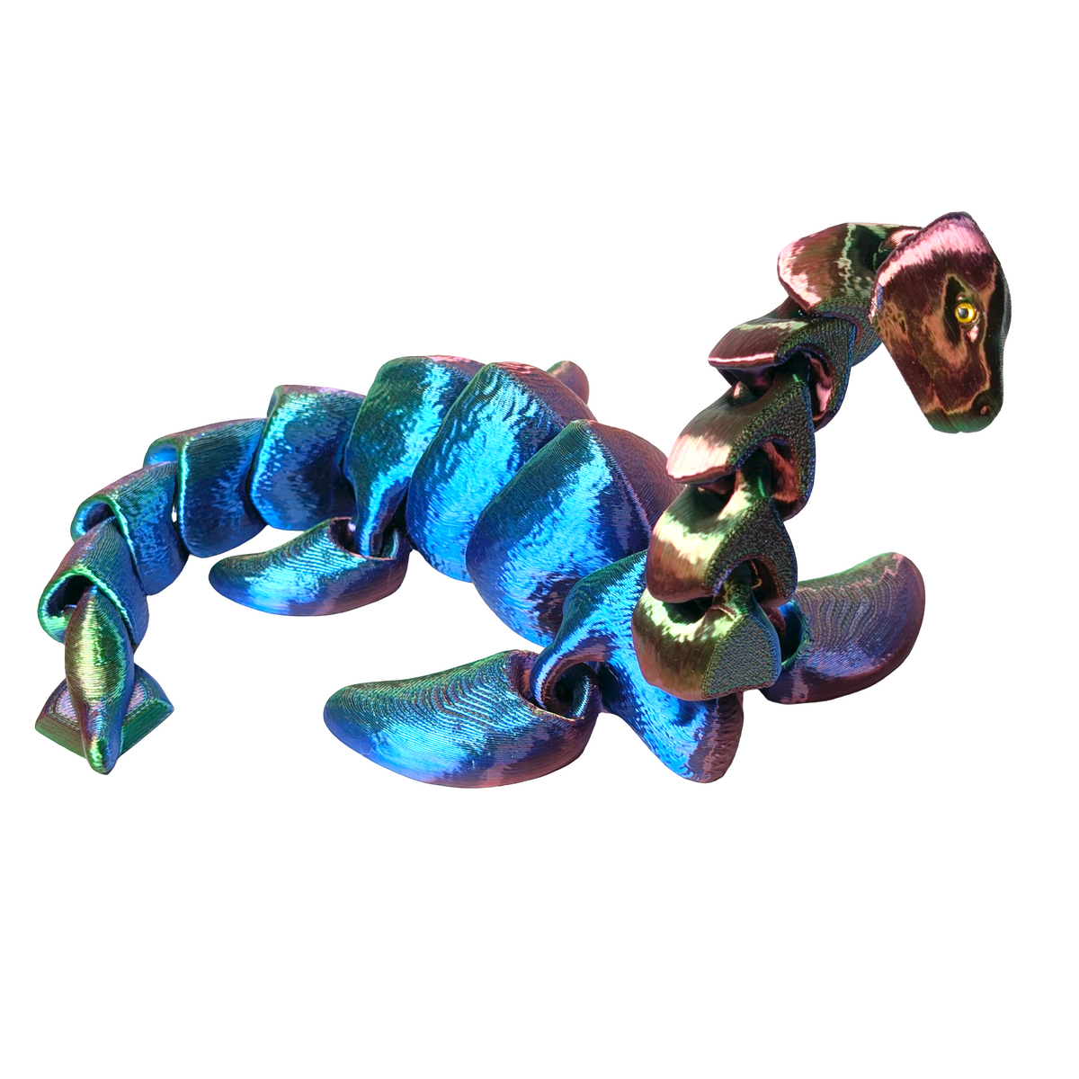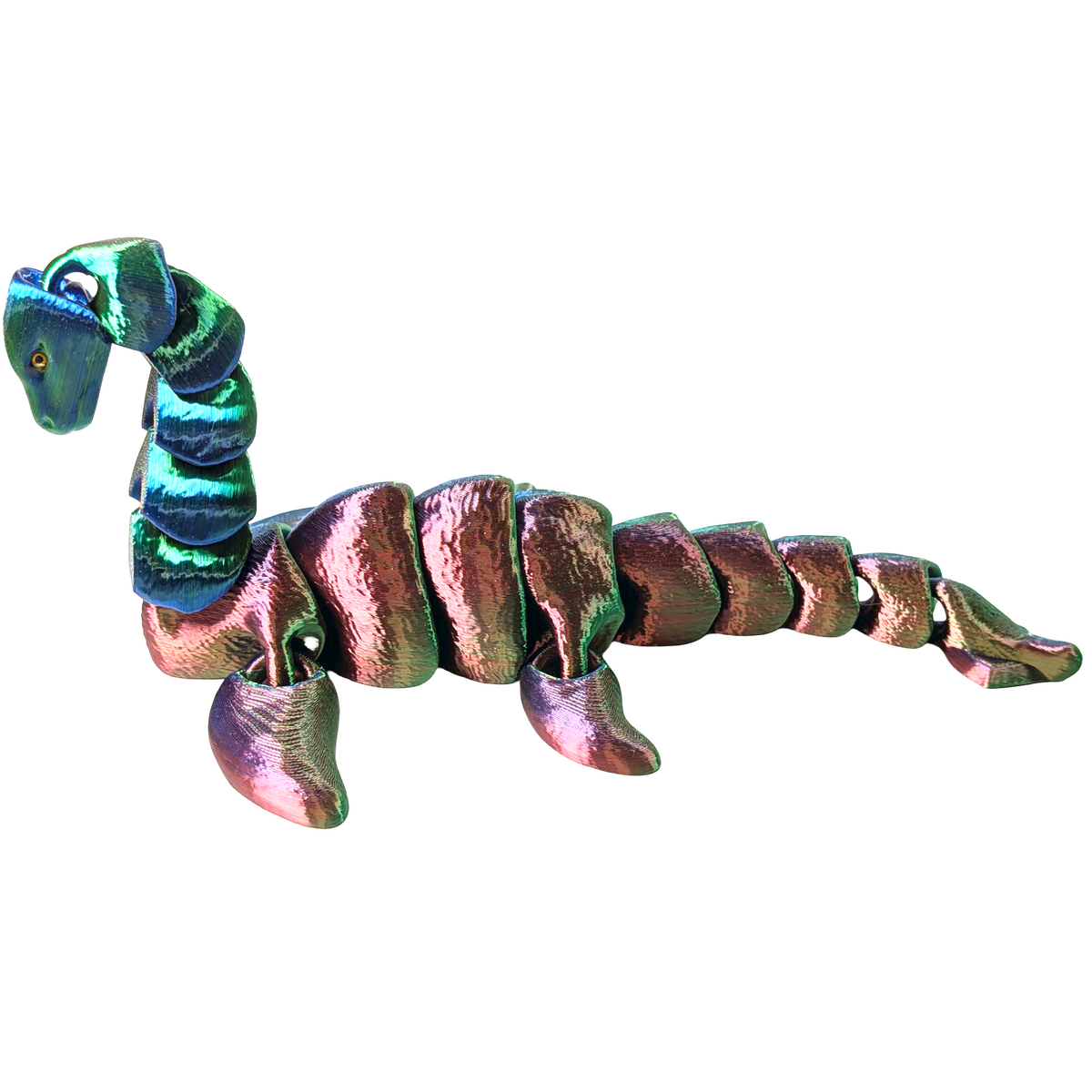 • Large flexible Loch Ness Monster figure in red, blue and gold tri-colour silk PLA