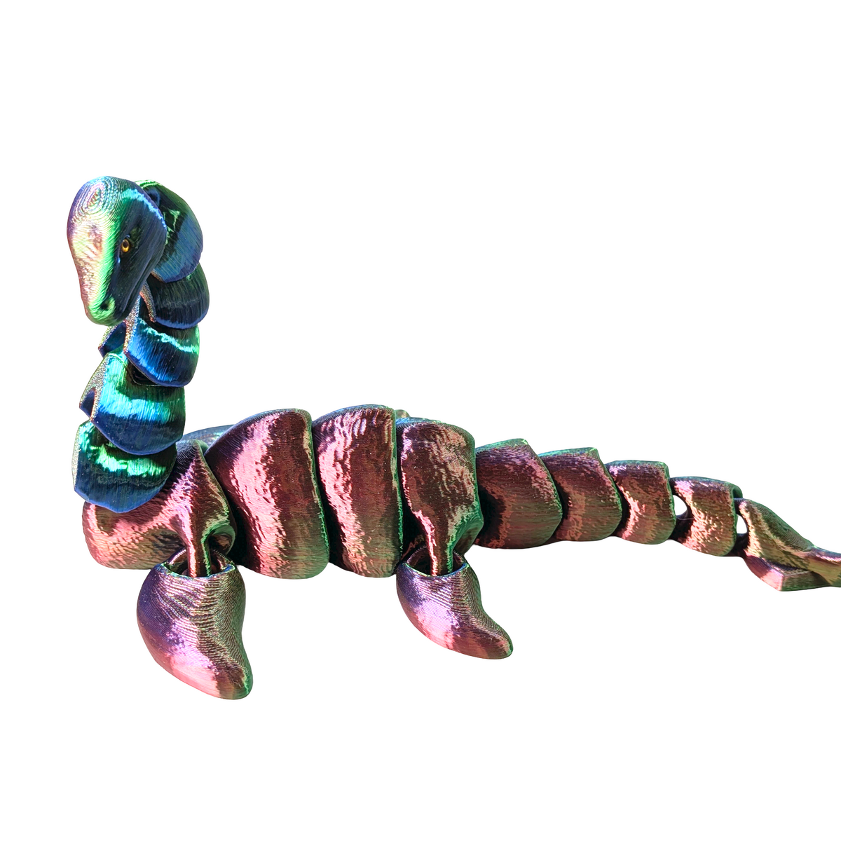 Created to be both decorative and functional where relevant. This Loch Ness Monster flexible figure captures the mystery of one of the world's most famous legends in a lifelike, articulated form. Often affectionately called "Nessie", the Loch Ness Monster has been part of Scottish folklore for generations. 3D printed in striking red, blue and gold tri-colour silk PLA, this large figure features 18 points of articulation, allowing for gentle posing and expressive display. Hand-applied eyes enhance the detailed finish, giving the piece added character. Designed by KEKreations and handmade by Supportive Solutions, this piece measures approximately 140 x 340 x 50 mm (5.51 x 13.39 x 1.97 inches) and weighs around 83 g. A distinctive display item for mythology enthusiasts, collectors and anyone who appreciates detailed 3D printed creations.