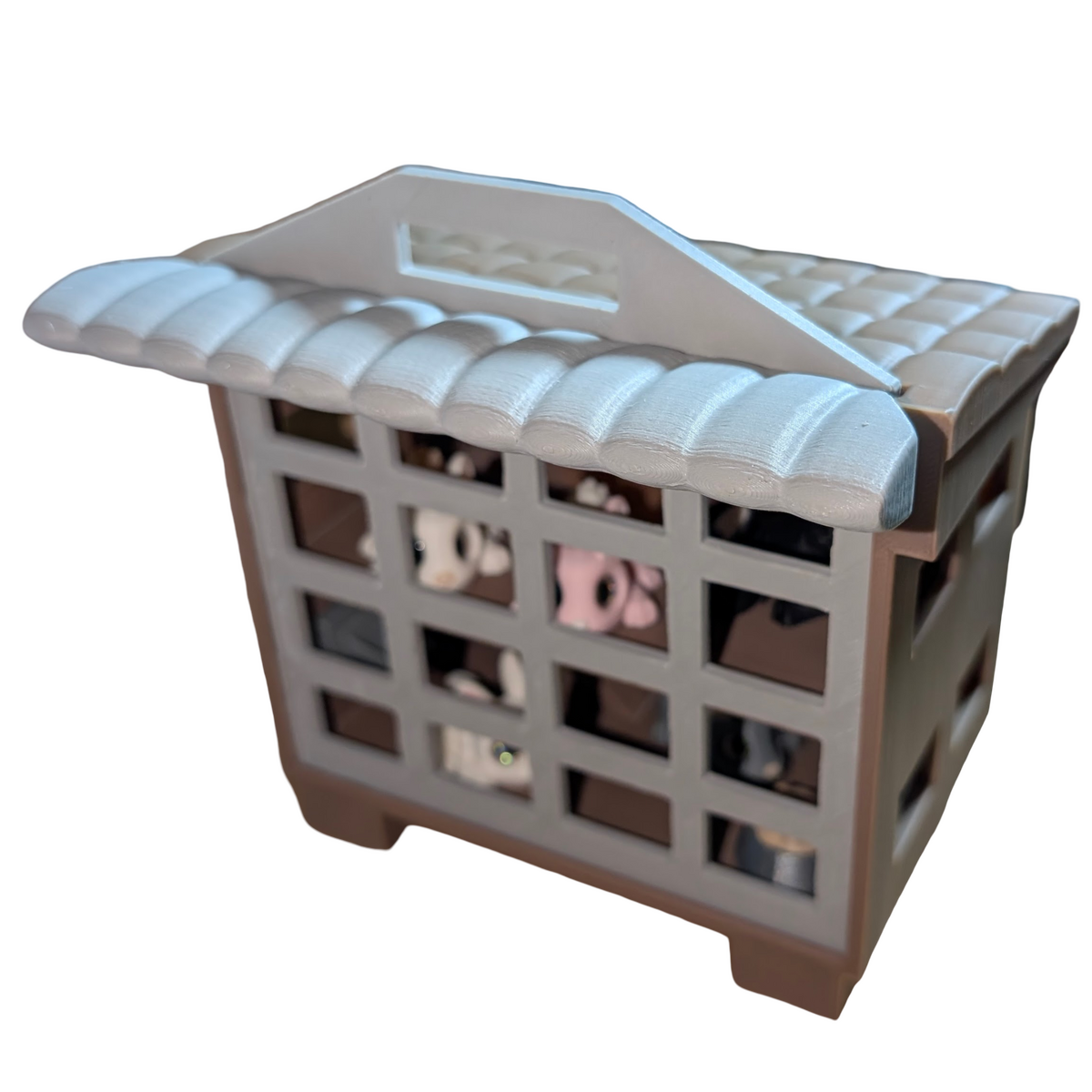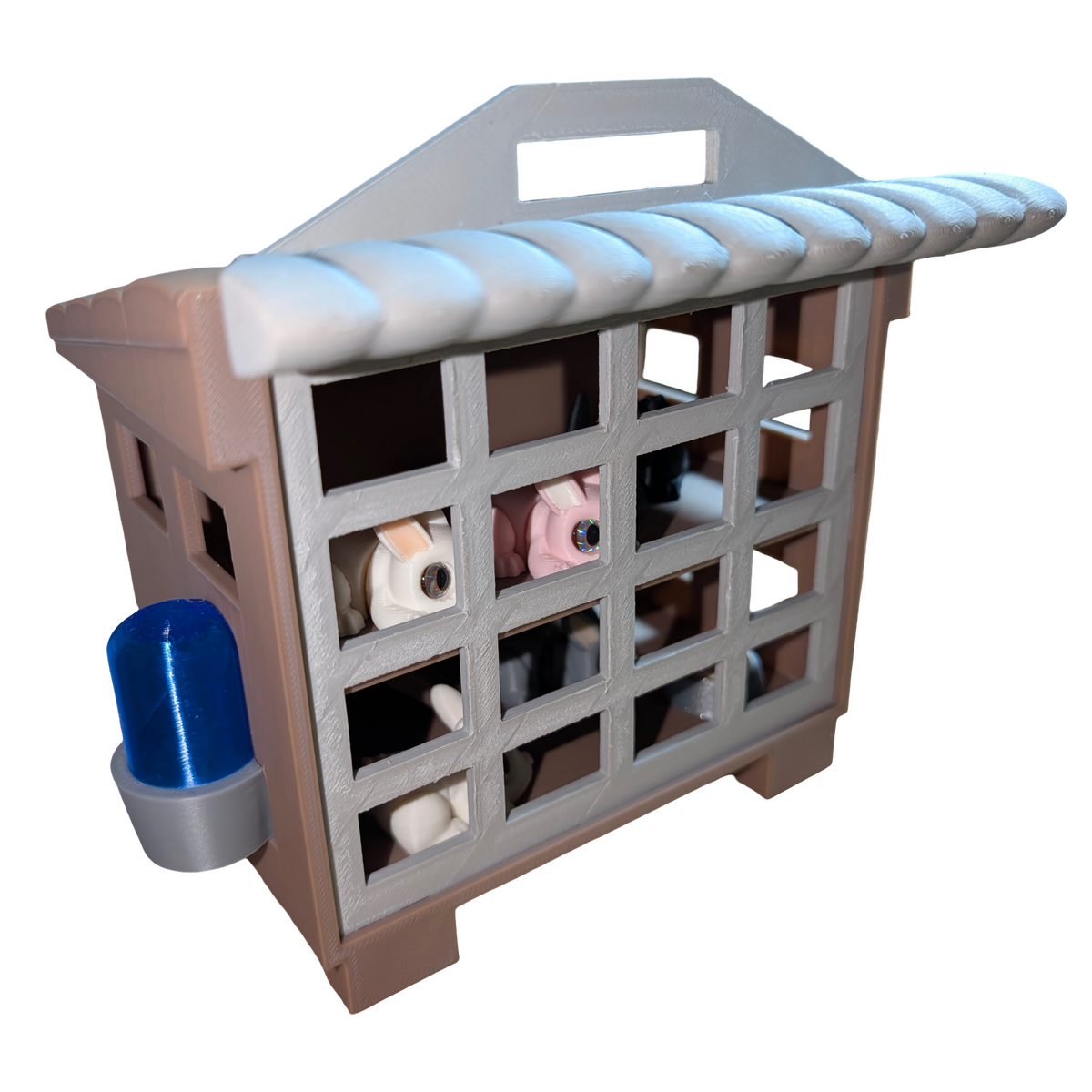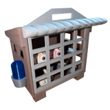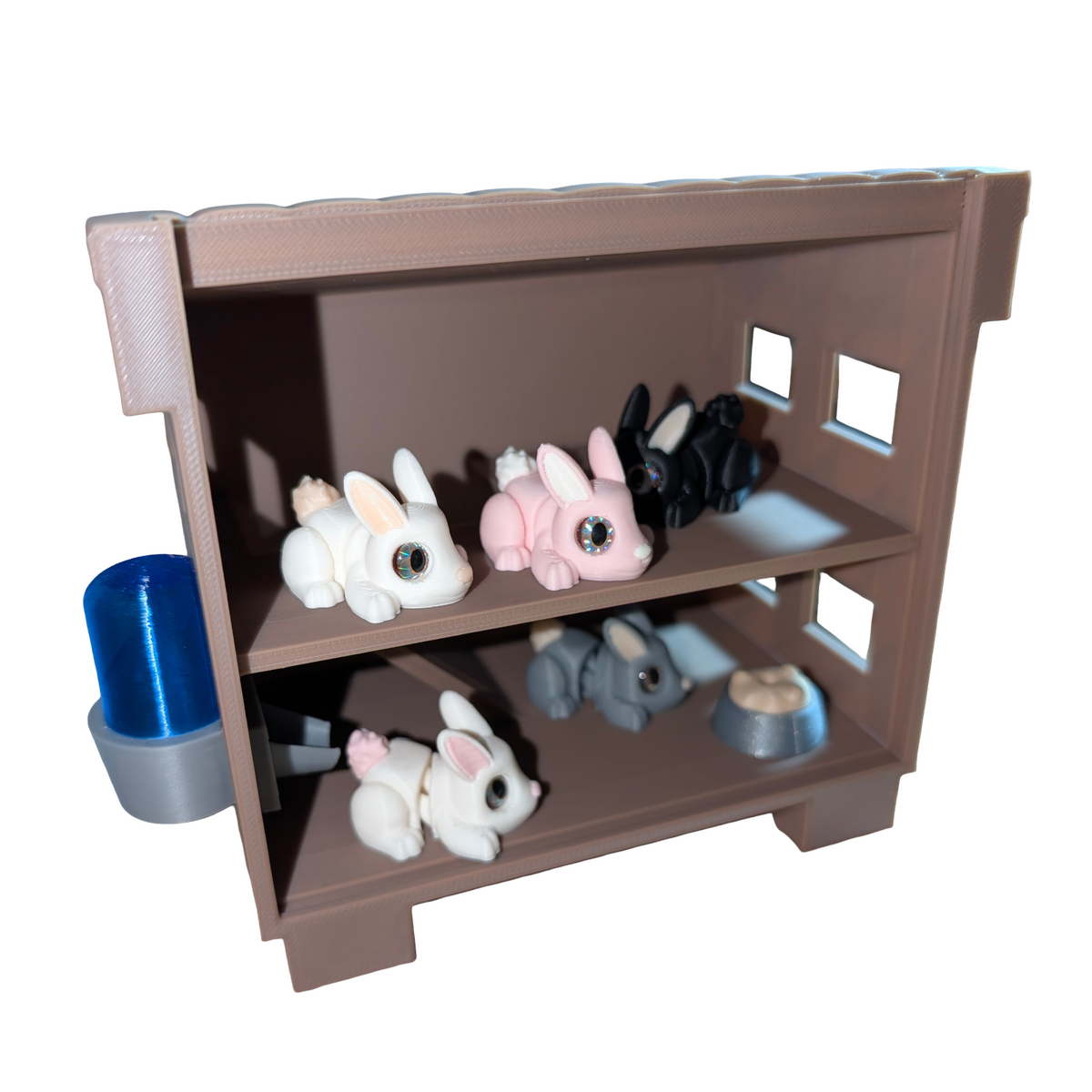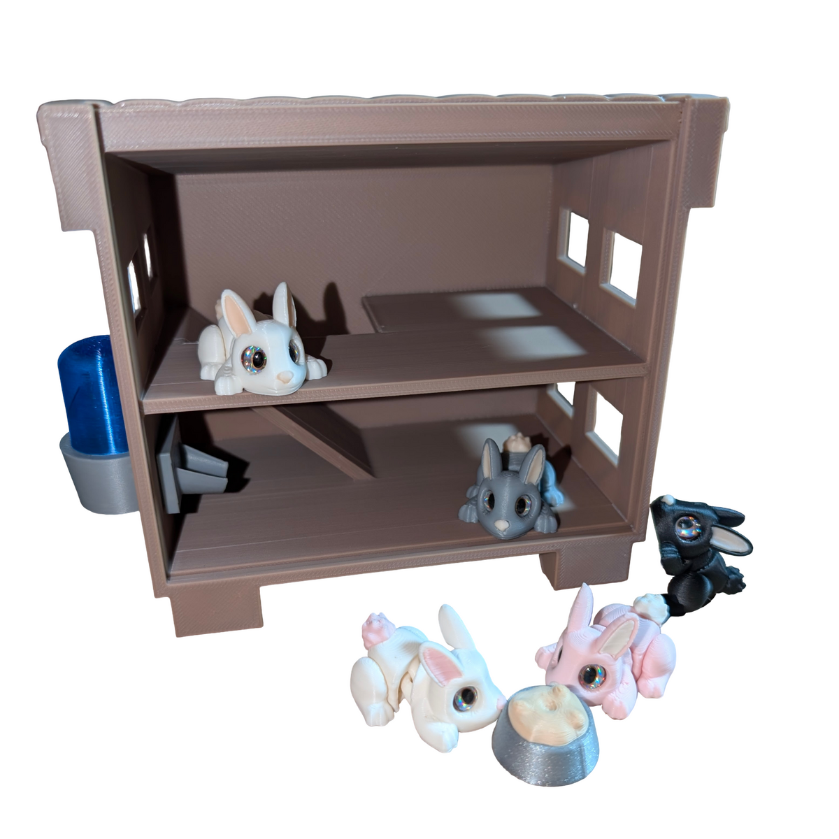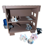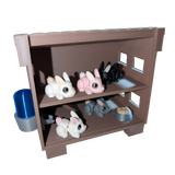 This Heritage Homestead miniature rabbit hutch playset brings a charming farm-style scene to life, featuring a detailed two-level hutch with a vertical sliding door, food bowl, and five articulated rabbits in different colours. Thoughtfully designed with hand-applied eyes and fine detail, it's a compact yet engaging display or play piece.