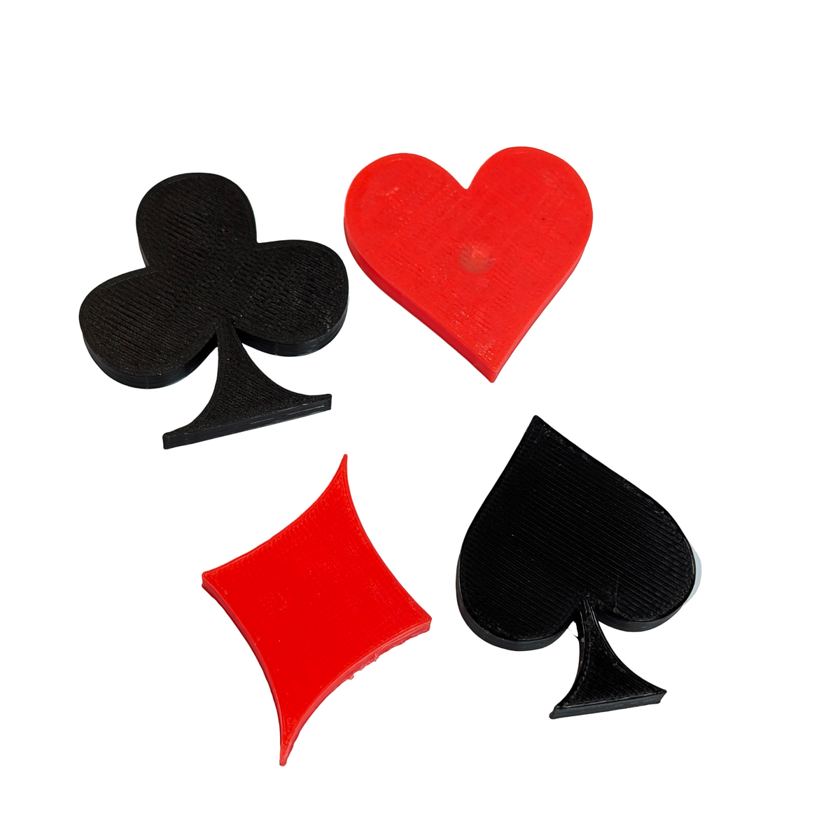 This set includes four magnets representing the standard playing card suits: hearts, diamonds, clubs, and spades. Each piece is finished in a multi-coloured PLA and designed with a clean, recognisable shape, making them suitable for both functional use and display. These classic symbols are widely recognised across card games and gaming culture.
