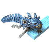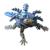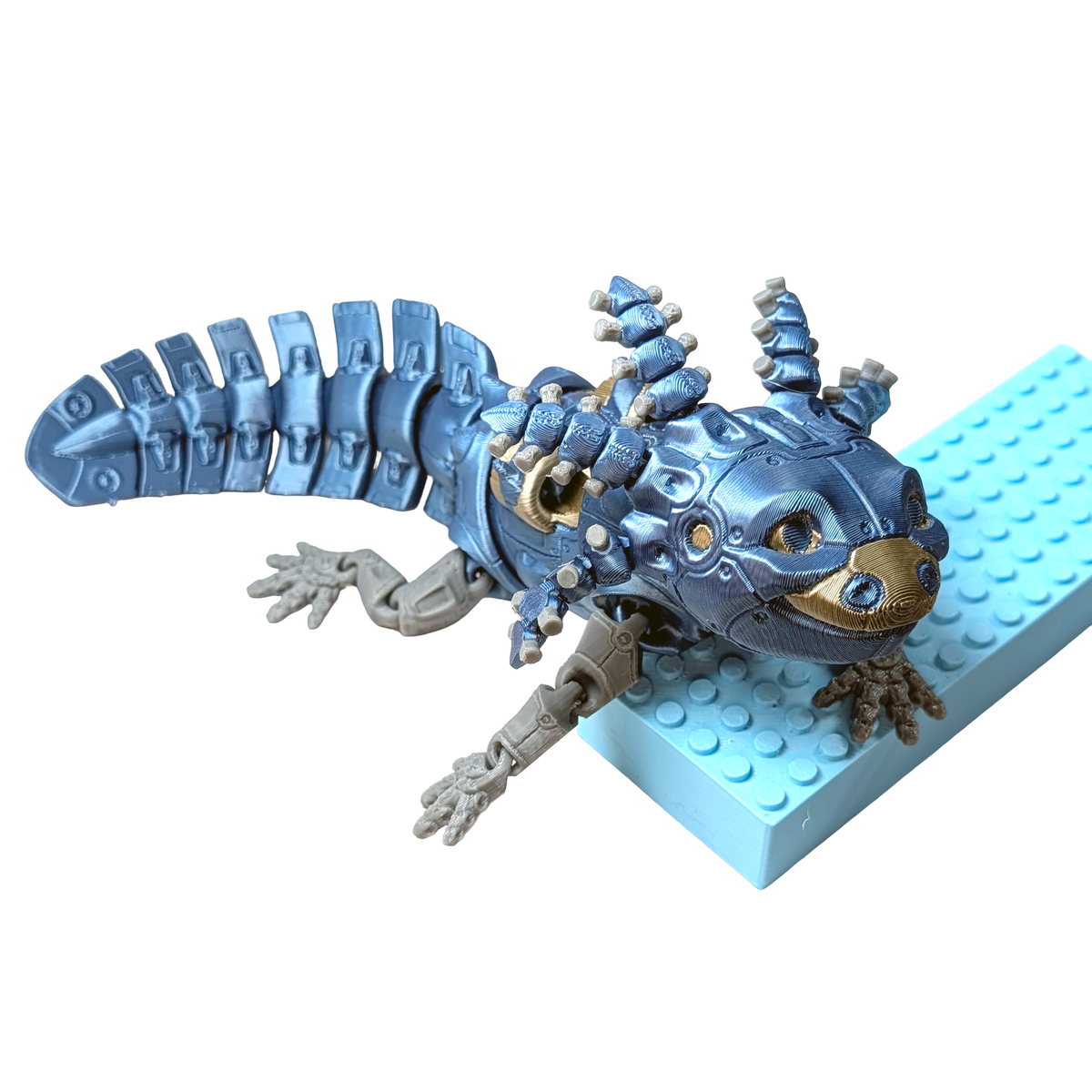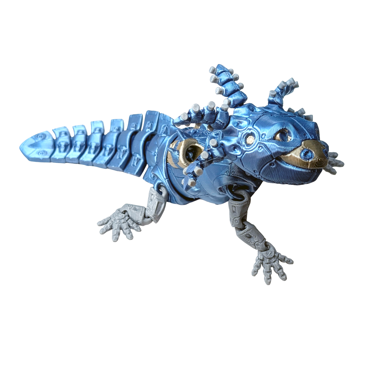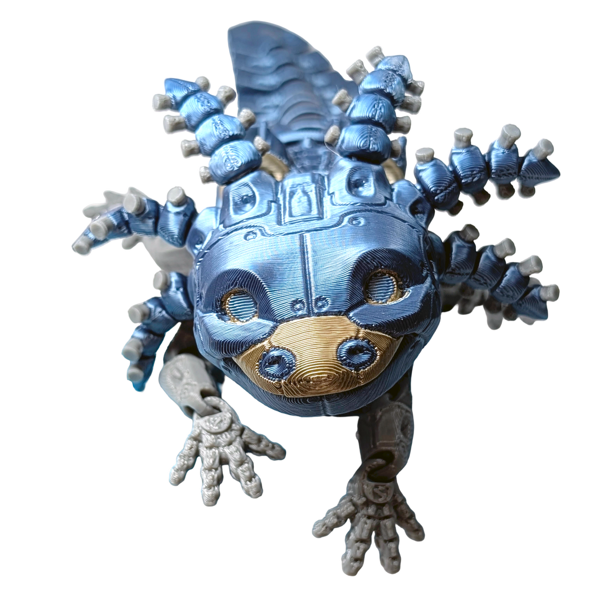 A 3D printed item that stands out through its design. This Robolotl flexible figure blends fantasy and mechanical styling into one intricately detailed model. Inspired by the distinctive shape of an axolotl and reimagined with robotic elements, it features jet engine details on its back and layered mechanical textures throughout. 3D printed in multi-coloured metallic PLA, including metallic blue, metallic champagne and grey tones, this large figure includes 47 points of articulation for highly poseable display. Hand-applied eyes and fine detailing enhance its lifelike yet futuristic appearance. Designed by MatMireMakes and handmade by Supportive Solutions, it measures approximately 220 x 120 x 75 mm (8.66 x 4.72 x 2.95 inches) and weighs around 76 g. A striking piece for desks, shelves or fantasy-themed collections.
