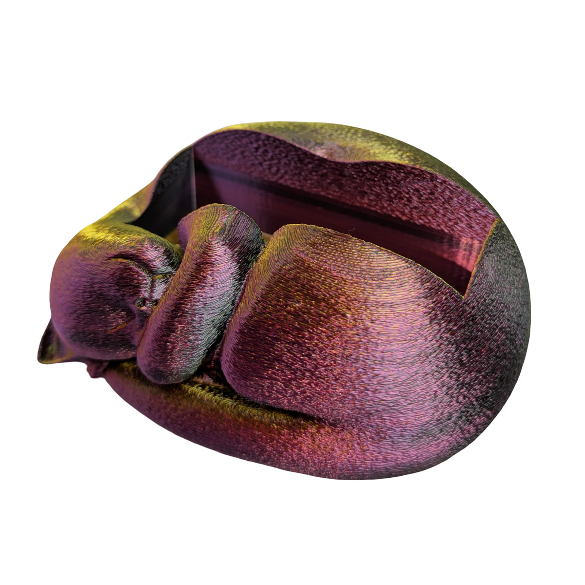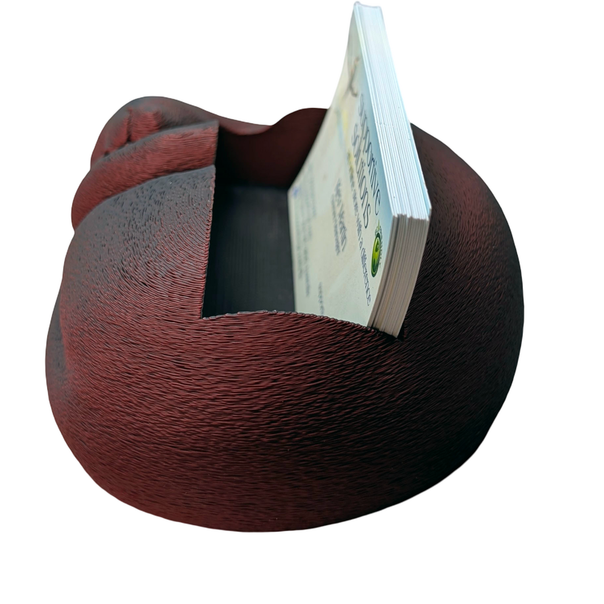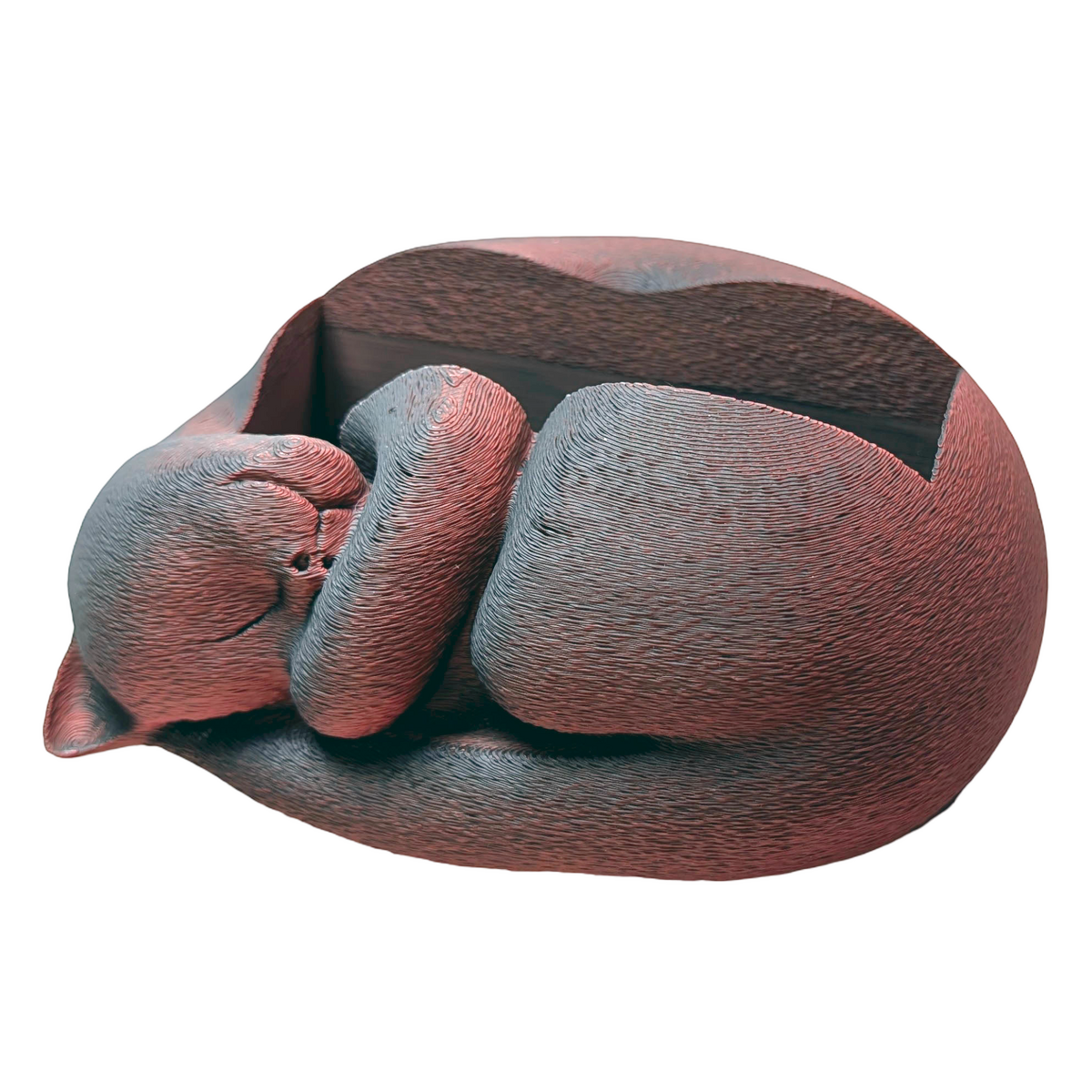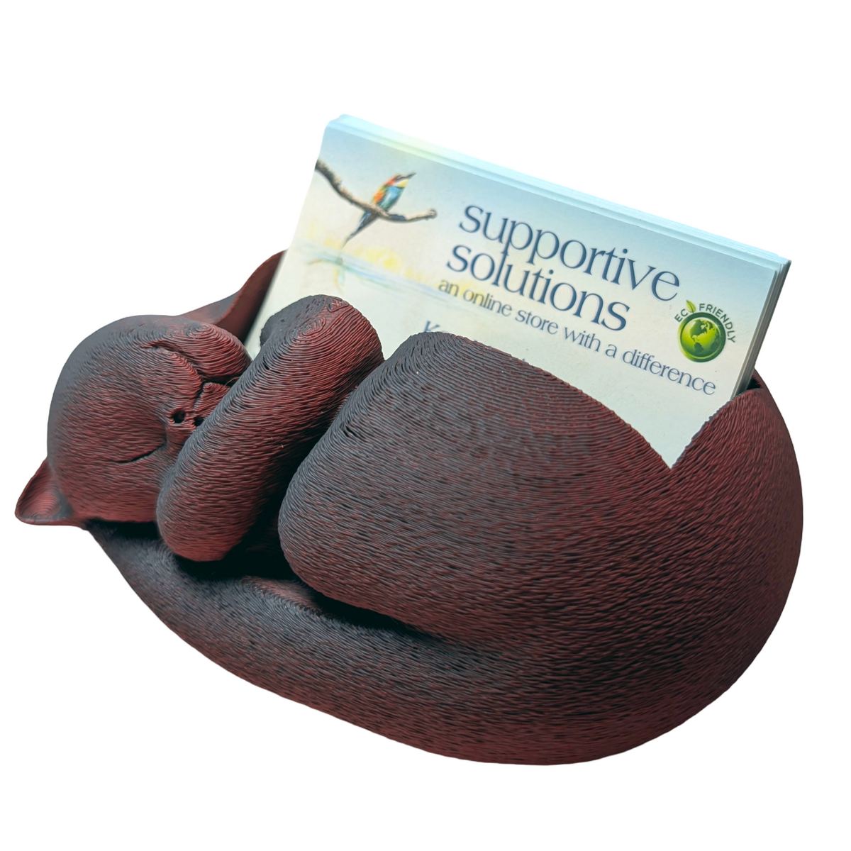 A modern take on a familiar concept using 3D printing. This sleeping cat business card holder combines everyday practicality with a relaxed decorative design. The sculpted cat rests across the card tray, creating a distinctive desk accessory suited to offices, reception desks, creative studios, or home workspaces. Produced in red and black dual colour matte PLA, the contrasting colours emphasise the contours of the sleeping cat design while maintaining a clean and contemporary appearance. The holder is designed to store up to 40 standard business cards, keeping them neatly organised and easy to access while also adding a characterful display element to a desk or counter. Designed by ShesCraftDee and handmade by Supportive Solutions in Australia.