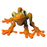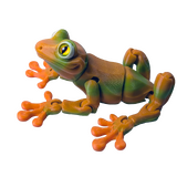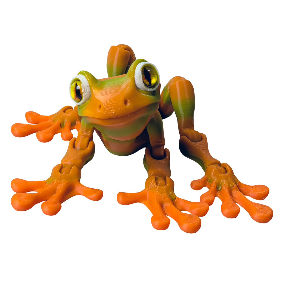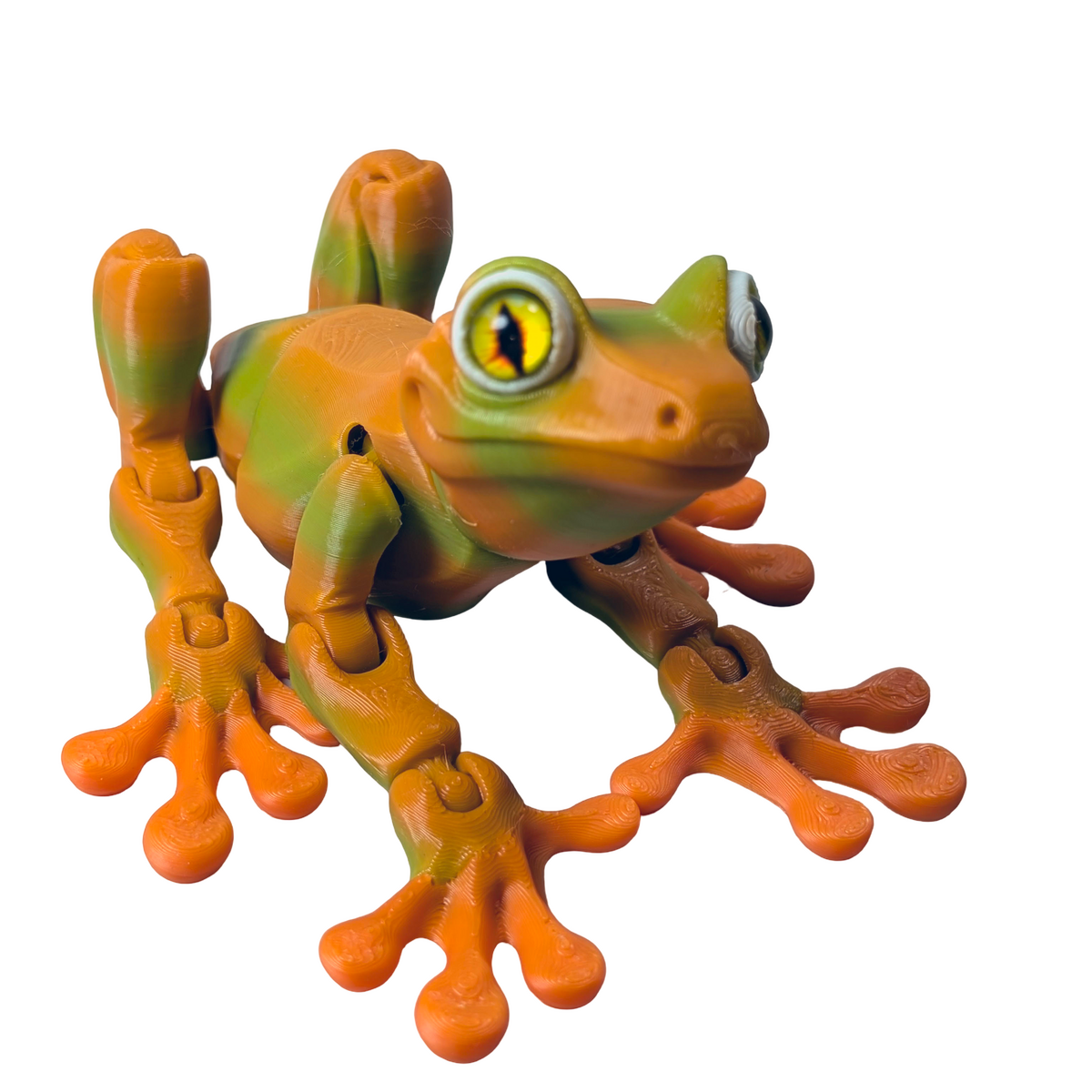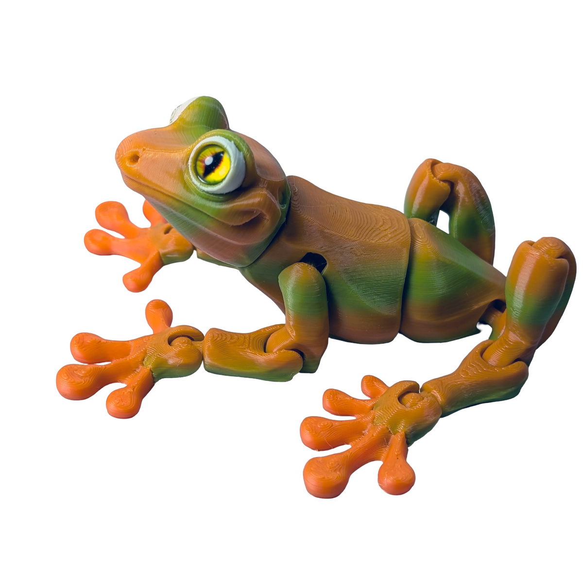 A unique piece that offers something different from mass-produced items. This tree frog flexible figure captures the distinctive stance and bright colouring often associated with these agile climbers. Tree frogs are widely recognised for their ability to grip and climb surfaces using specialised toe pads. 3D printed in glossy green and orange PLA, this large figure features 16 points of articulation for poseable display. It also includes 10 built-in magnets, allowing it to function as an interactive and educational fridge magnet or creative display piece on compatible metal surfaces. Hand-applied eyes enhance its lifelike representation, while the integrated magnet system adds a practical, functional twist. Designed by MatMireMakes and handmade by Supportive Solutions, it measures approximately 210 x 120 x 70 mm (8.27 x 4.72 x 2.76 inches) and weighs around 60 g. From Australia.
