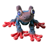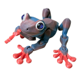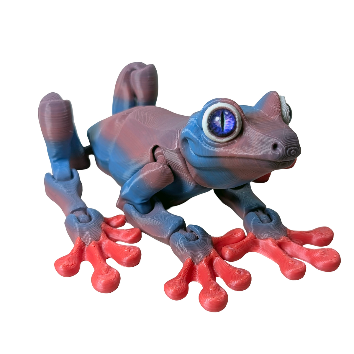 Designed with display and everyday use in mind. This tree frog flexible figure captures the distinctive body shape and climbing stance associated with these agile amphibians. Tree frogs are widely recognised for their gripping toe pads, allowing them to cling to surfaces with ease. 3D printed in glossy purple, blue and pink PLA, this large figure features 16 points of articulation for poseable display. It also includes 10 built-in magnets, allowing it to function as an interactive and educational fridge magnet or creative display piece on compatible metal surfaces. Hand-applied eyes enhance its lifelike representation, while the integrated magnet system adds a practical twist. Designed by MatMireMakes and handmade by Supportive Solutions, it measures approximately 210 x 120 x 70 mm (8.27 x 4.72 x 2.76 inches) and weighs around 60 g. From Australia.