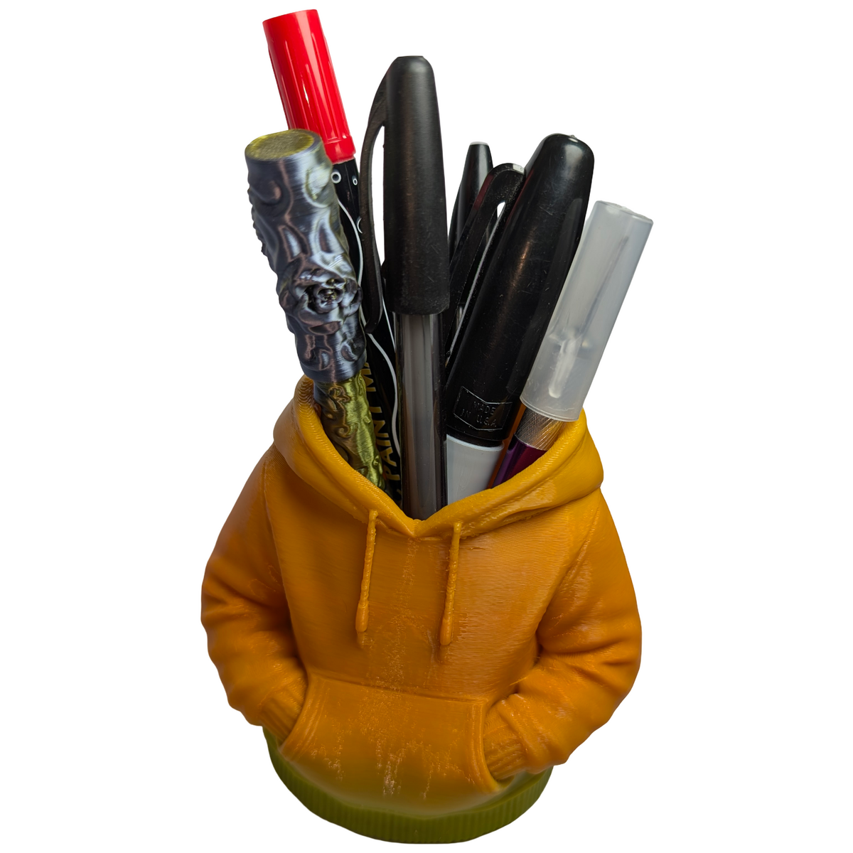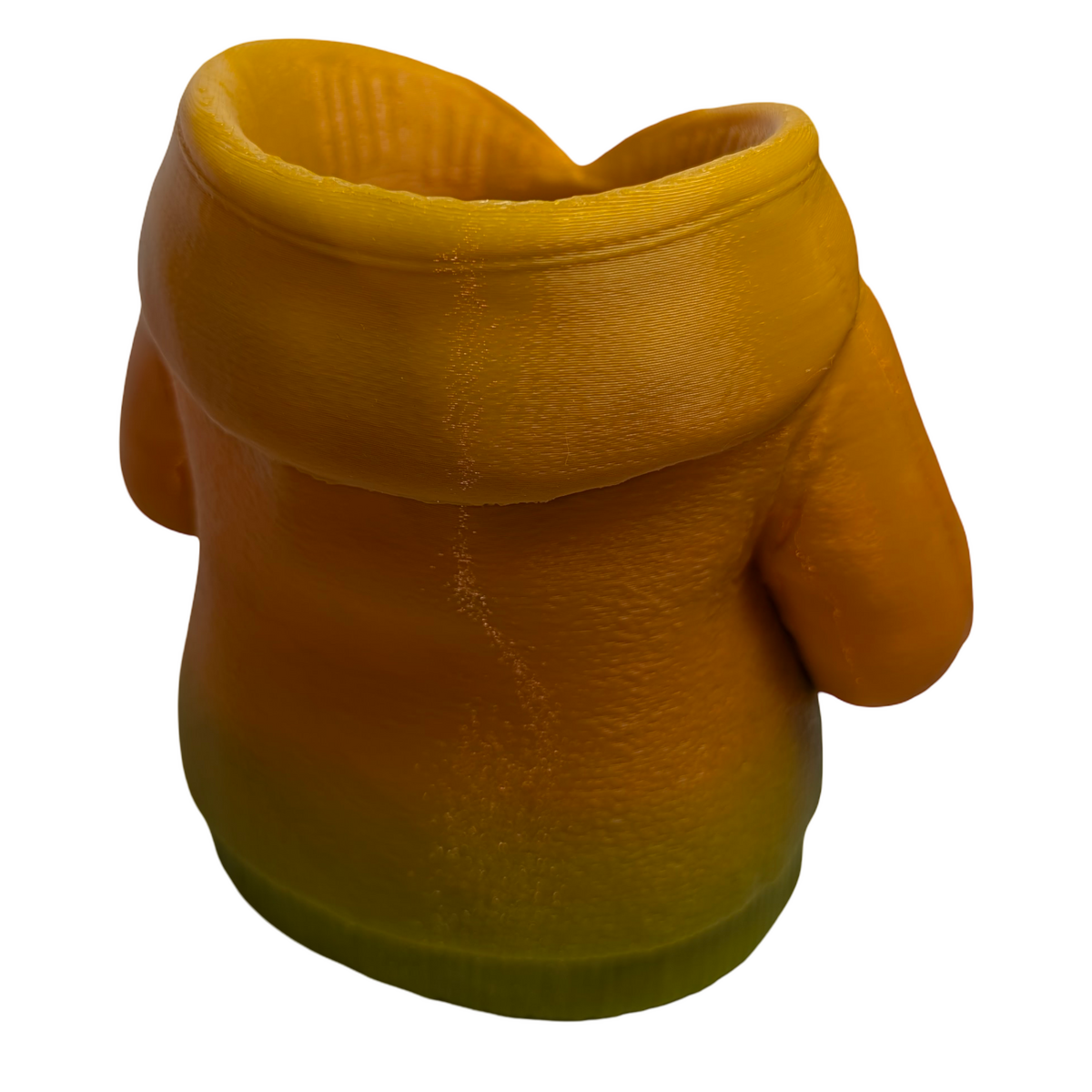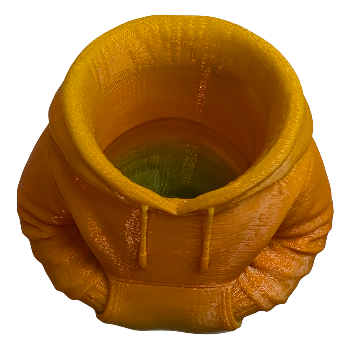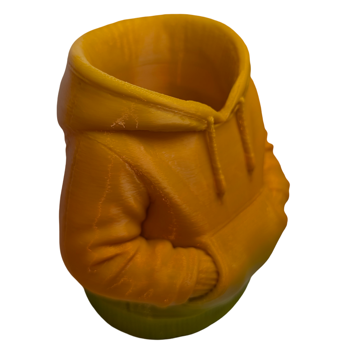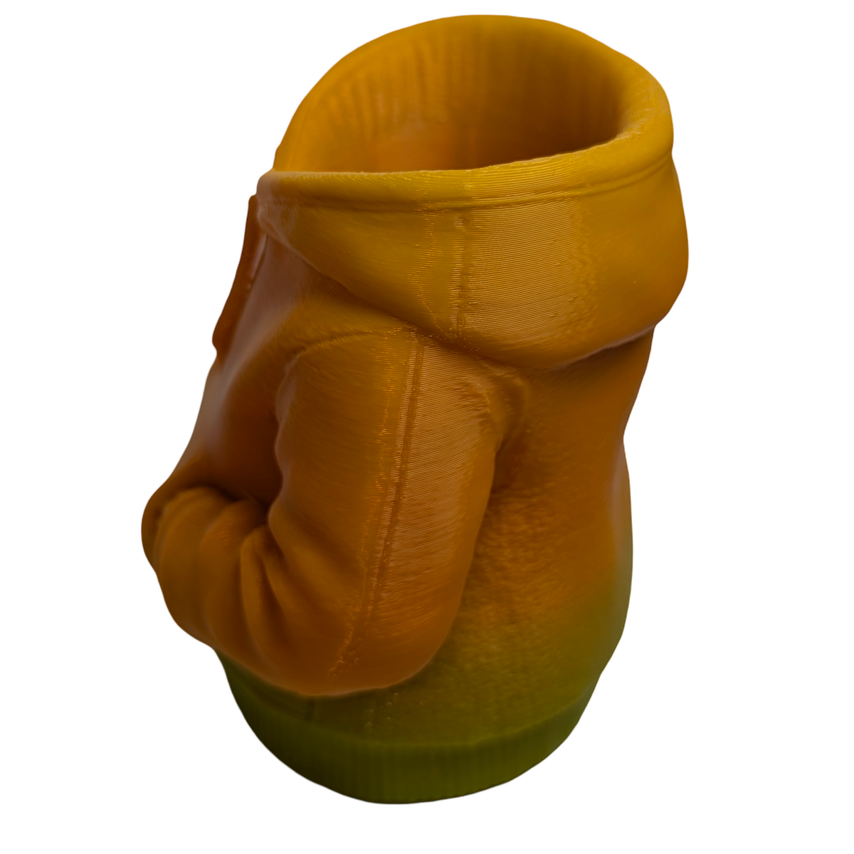 A 3D printed item that stands out through its design. This figural urban hoodie pencil holder provides a practical way to organise pens, pencils, and small desk accessories while adding a contemporary street-inspired element to a workspace. The sculpted hoodie design gives the piece a distinctive look that works well on desks, shelves, or study areas. Produced in green and gold matte gradient PLA, the shifting colour finish highlights the contours and details of the sculpted form. Lightweight yet sturdy, it functions comfortably as a desk organiser while also serving as a decorative display piece. The design can also double as a small planter if desired, making it suitable for desks, window sills, or decorative shelving. Designed and handmade by Supportive Solutions in Australia.