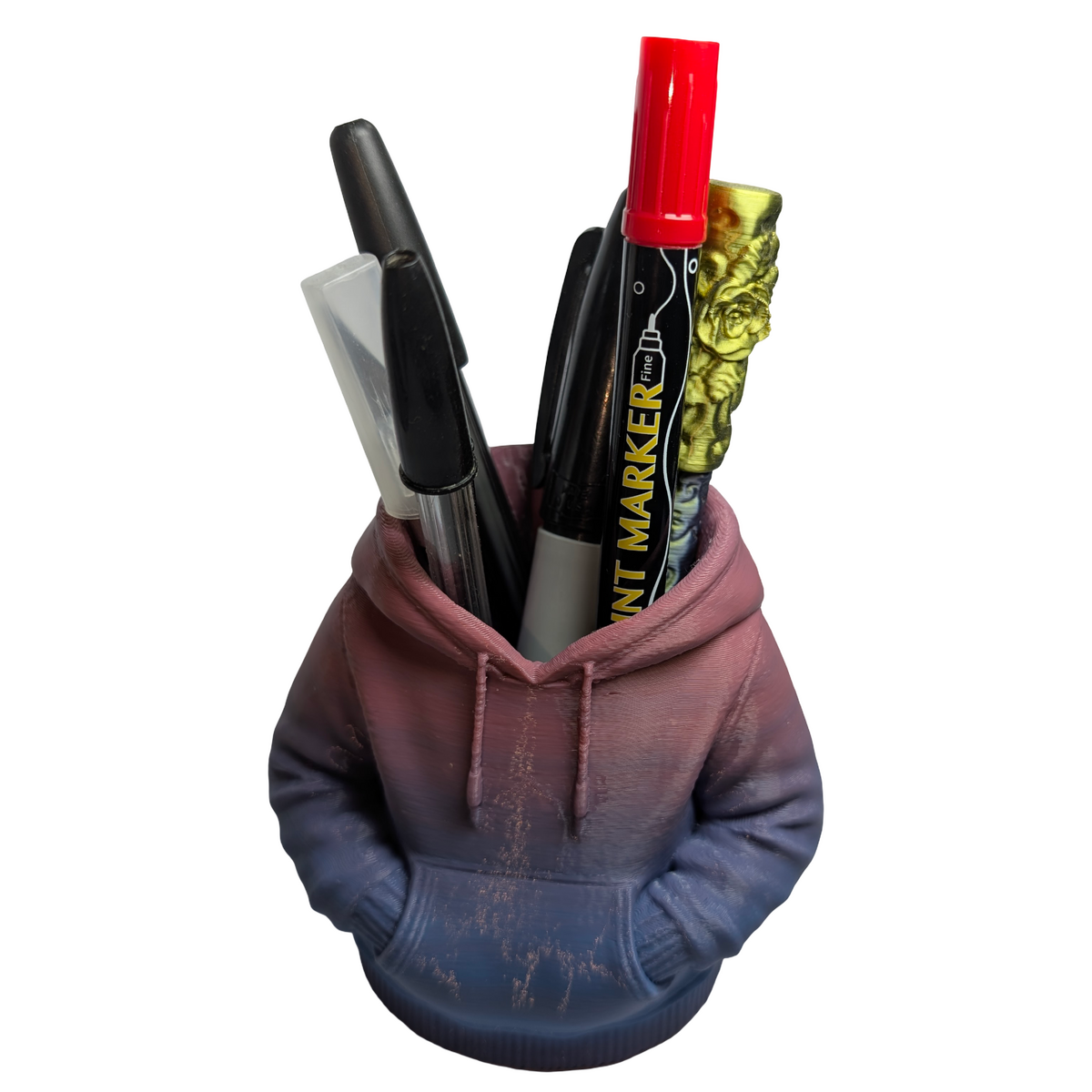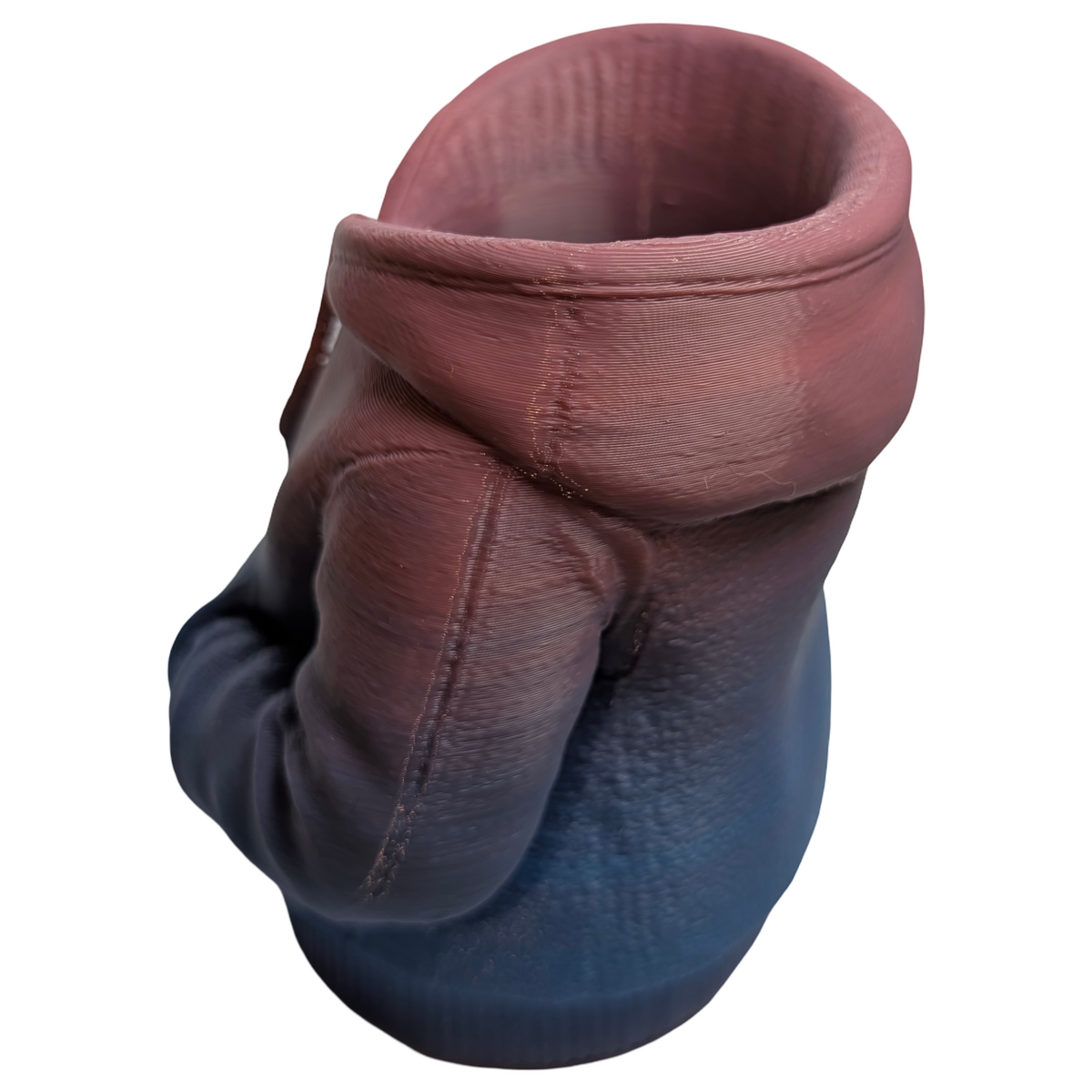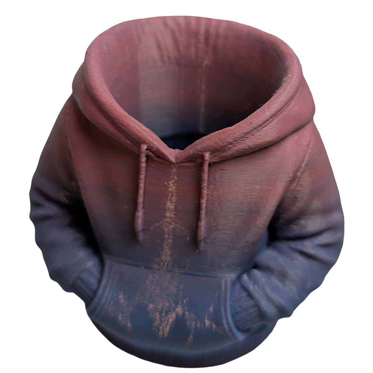 A practical blend of form and visual appeal. This figural urban hoodie pencil holder provides a convenient way to organise pens, pencils, and small desk accessories while adding a contemporary street-inspired element to a workspace. The sculpted hoodie design gives the piece a distinctive look that works well on desks, shelves, or study areas. Produced in pink and blue matte gradient PLA, the shifting colour finish highlights the contours and details of the sculpted form. Lightweight yet sturdy, it functions comfortably as a desk organiser while also serving as a decorative display piece. The design can also double as a small planter if desired, making it suitable for desks, window sills, or decorative shelving. Designed and handmade by Supportive Solutions in Australia.